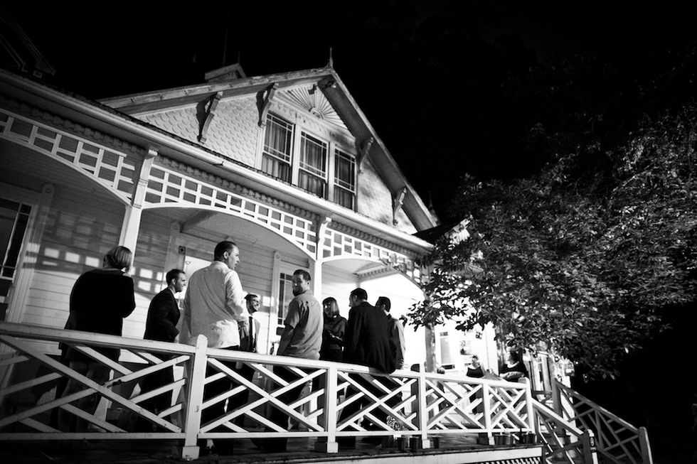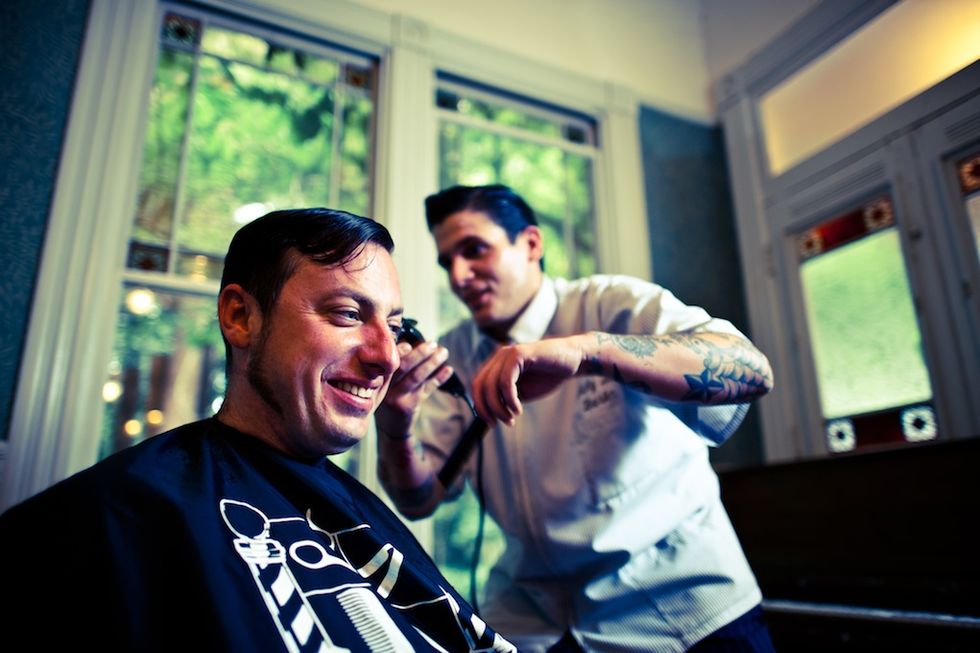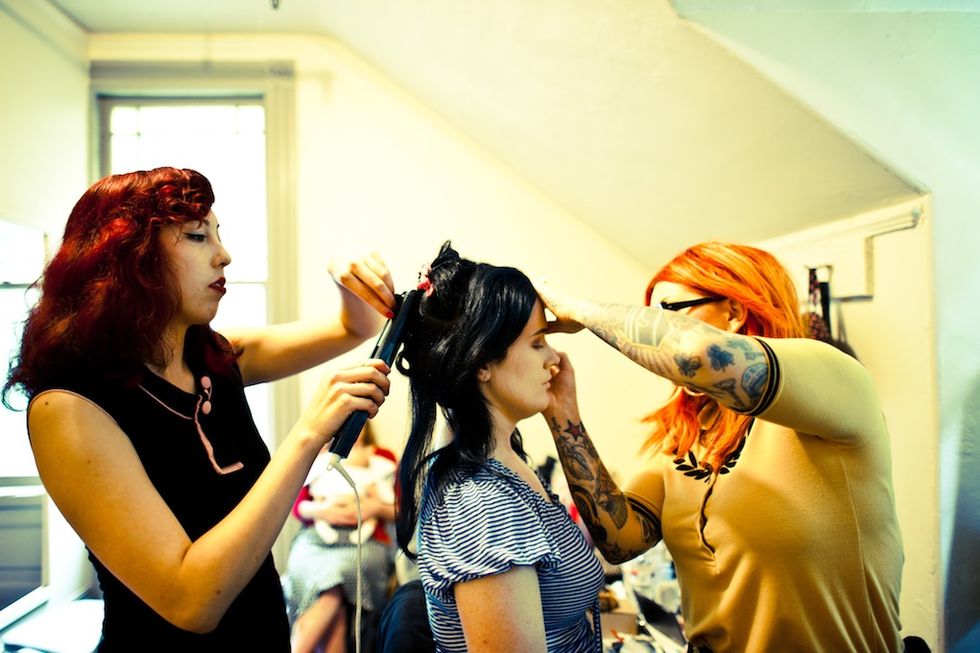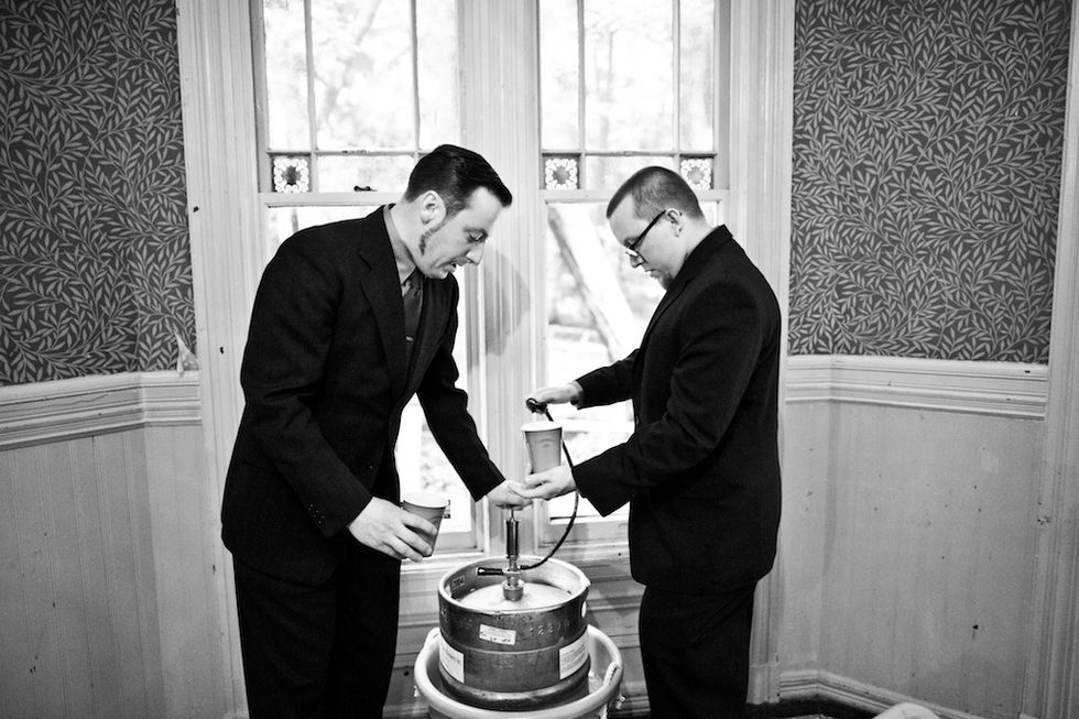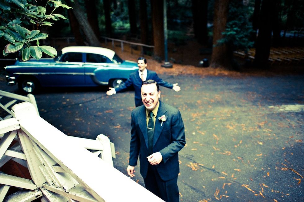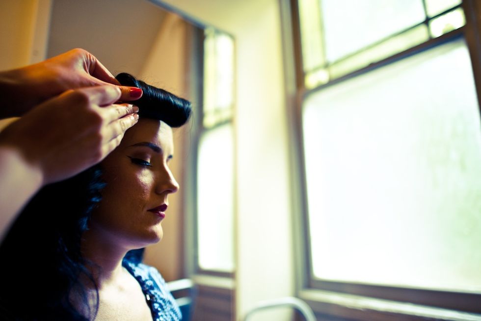 The groom got ready with some man-time, treating friends to old school-style pompadour haircuts by Nicky the Barber of Bay City Barber Salon, while the bride’s retro-style ‘40s coif was masterfully crafted by Miss Summer of On Mars on Fillmore Street.