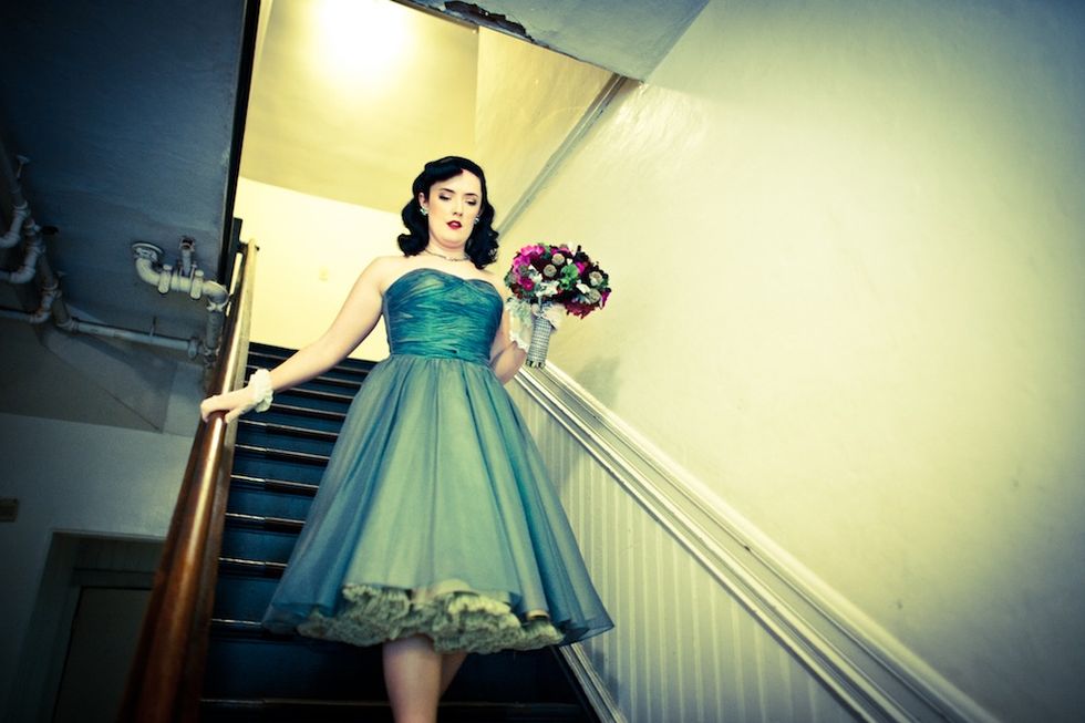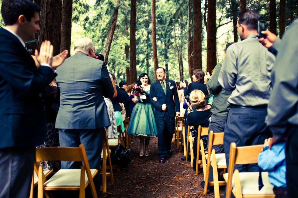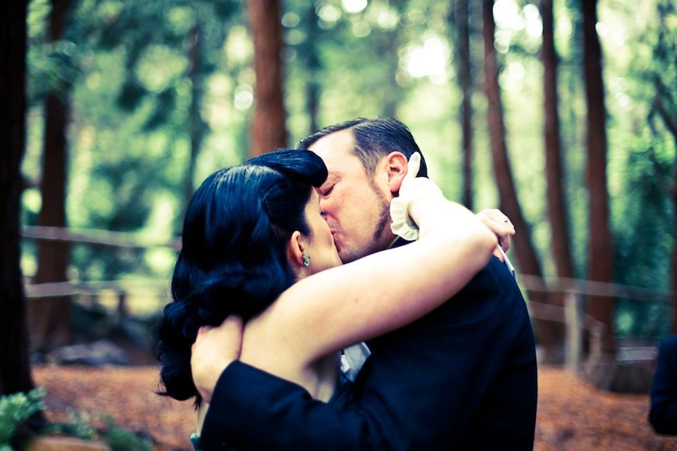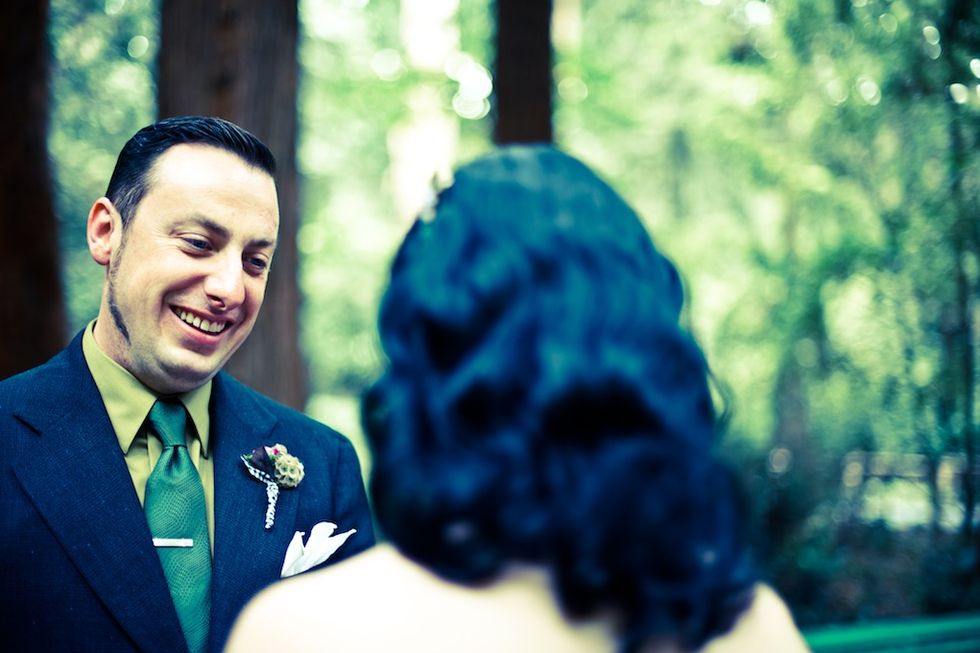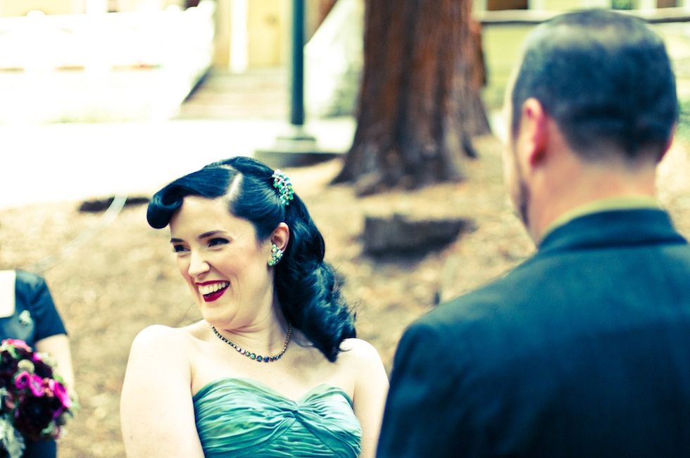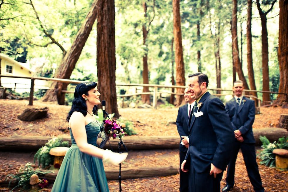 Nestled deep in the misty redwood grove of Stern Grove on September 17, two lovers wed their passion for vintage lifestyle, DIY aesthetic, and rustic Americana in a woodland whimsy wedding. Owen Bradley Ray wrote the entire ceremony for his bride Caitlin Moneypenny-Johnston. The bride wore a ‘50s blue-green strapless tea-length frock from Dear Golden Vintage, the groom a ‘40s fleck suit bought from Decades of Fashion on Haight Street. The bride completed her ensemble with vintage organza ruffle gloves, vintage rhinestone jewelry, a black vintage ‘50s bustier and rum-filled flask-holster garter from Dollhouse Bettie on Haight Street.