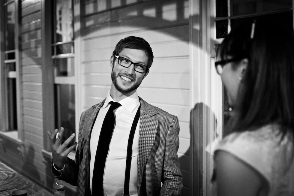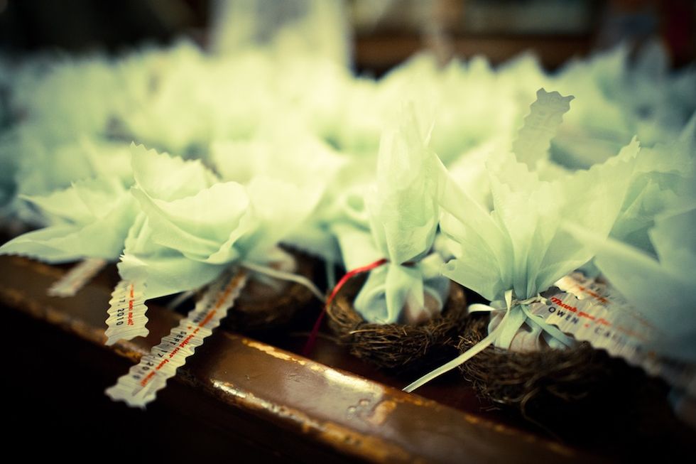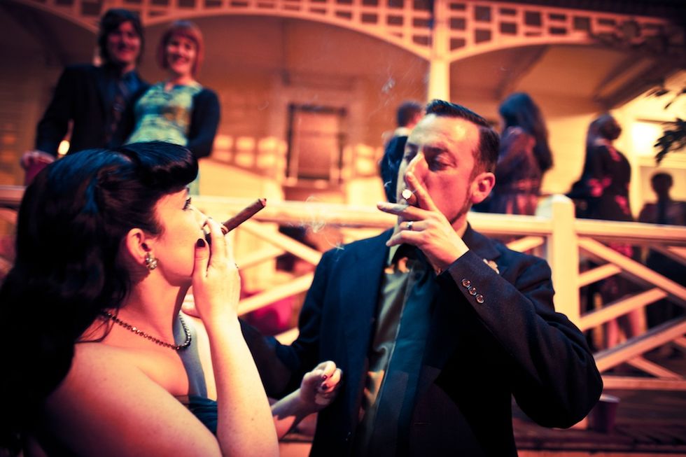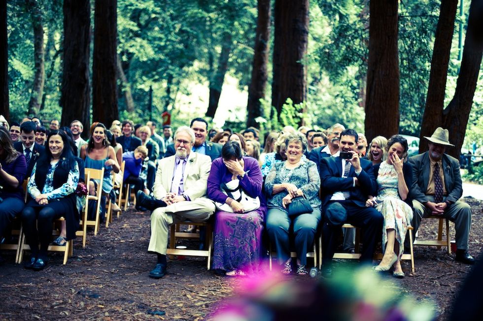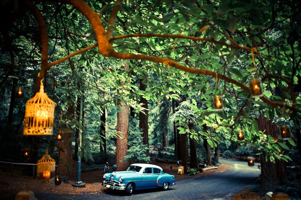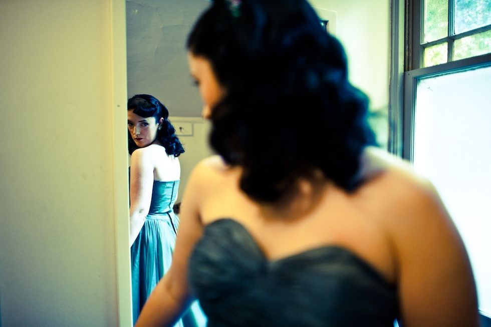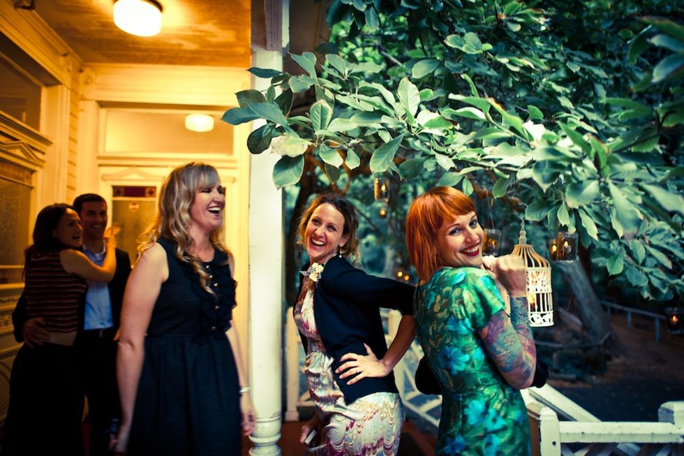 Nestled deep in the misty redwood grove of Stern Grove on September 17, two lovers wed their passion for vintage lifestyle, DIY aesthetic, and rustic Americana in a woodland whimsy wedding. Owen Bradley Ray wrote the entire ceremony for his bride Caitlin Moneypenny-Johnston. The bride wore a ‘50s blue-green strapless tea-length frock from Dear Golden Vintage, the groom a ‘40s fleck suit bought from Decades of Fashion on Haight Street. The bride completed her ensemble with vintage organza ruffle gloves, vintage rhinestone jewelry, a black vintage ‘50s bustier and rum-filled flask-holster garter from Dollhouse Bettie on Haight Street.