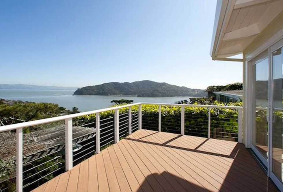 Built in 1962, this 2-bed, 2.5-bath house has been respectfully renovated, and although the saltillo terra-cotta tiles probably date to the 80's, the tongue & groove ceilings have been sandblasted and there's a recent kitchen in the usual light wood with black granite— just better than most. The real reason to buy this house is the views, looking out over the neighbors towards Angel Island, plus it's ready to move into. We'd be quite happy with just the master bedroom and deck, above. Open Sunday, March 4 from 2 pm to 4 pm