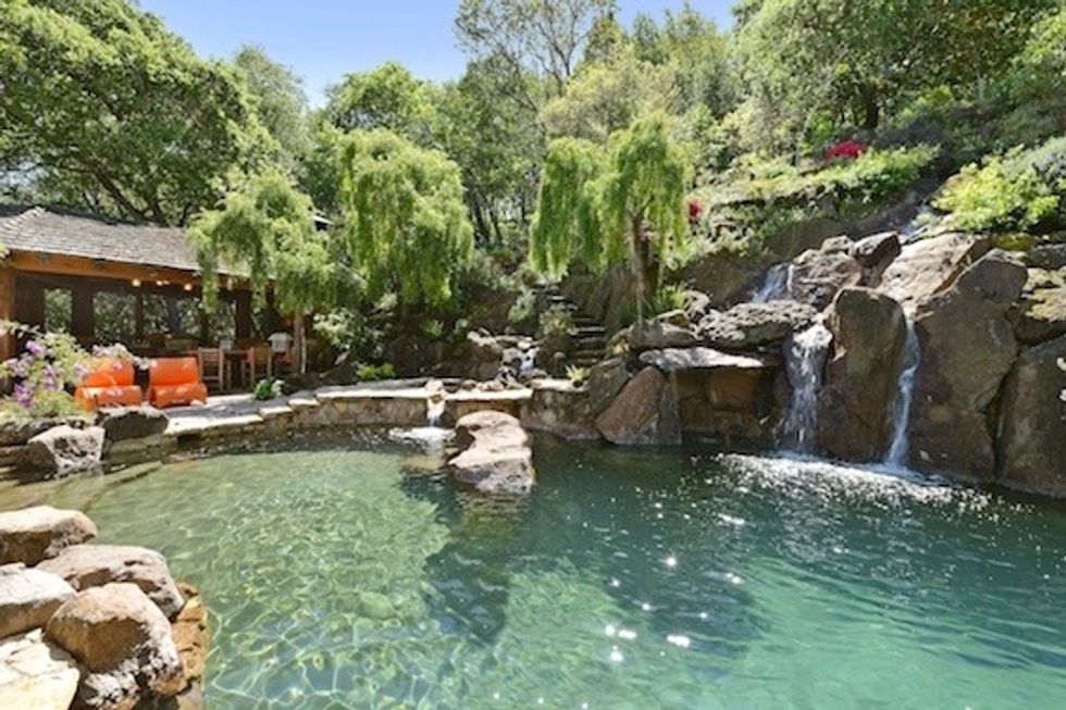 With this stone and timber outdoor kitchen and saltwater pool– with real boulders, a waterfall, and a cabana/bath nearby– we'd be happy just pitching a tent on the patio.