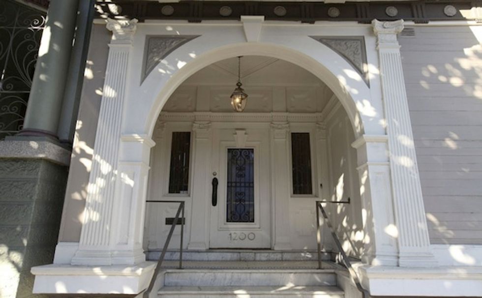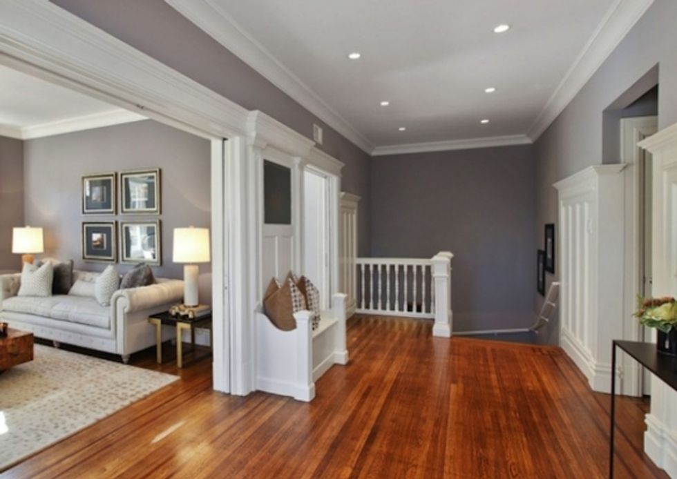 From the private arched entrance (top) on Page Street, a stairway leads up to this handsome hall that stretches across the full width of the flat.