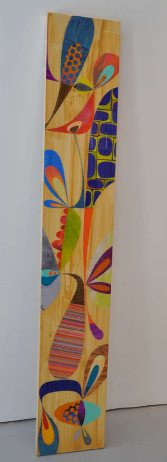 The exhibit features new pieces—same vivid colors, same abstract shapes—on canvas and wood. In addition to the gallery installation, Ray has also created 30-foot banners, which are on display in Hallidie Plaza on Powell Street right where the cable cars turn around. The banners will be used by Rickshaw Bags to create a line of messenger bags that will be auctioned off for charity.