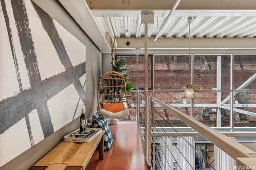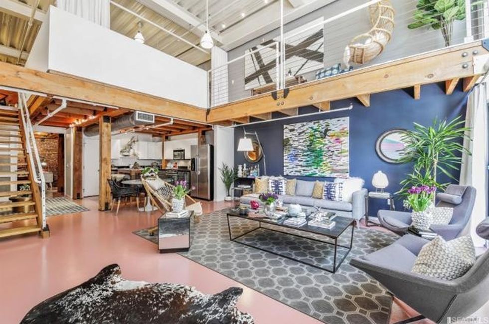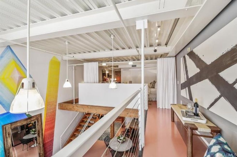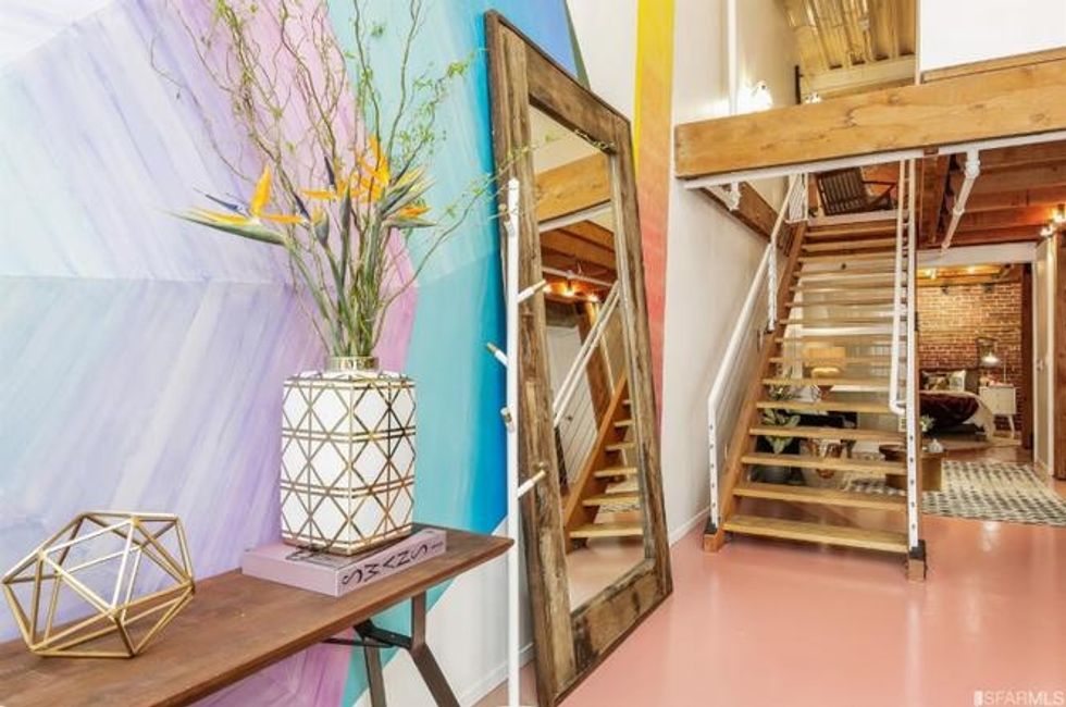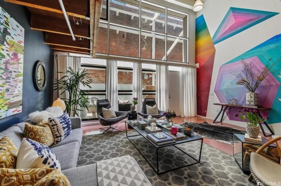 Contemporary art meets San Francisco's industrial past in this two-level, live-work loft with a custom, geometric rainbow mural by Austin-based artist Josef Kristofoletti.