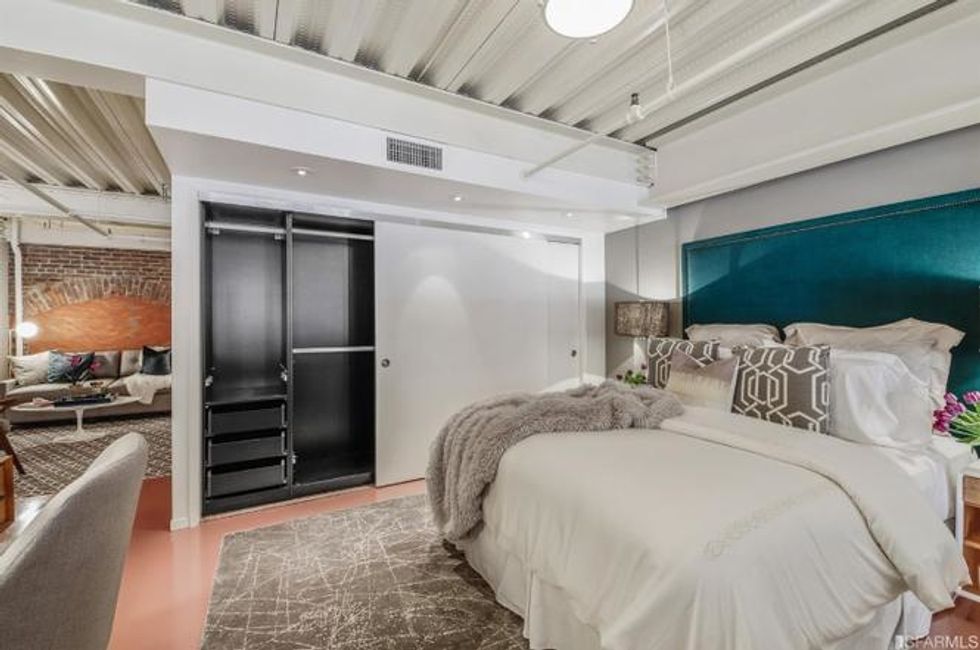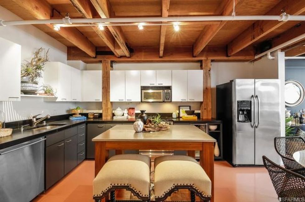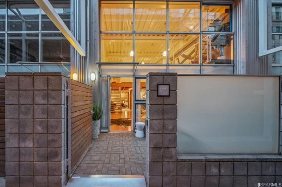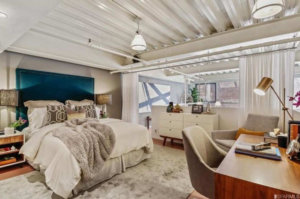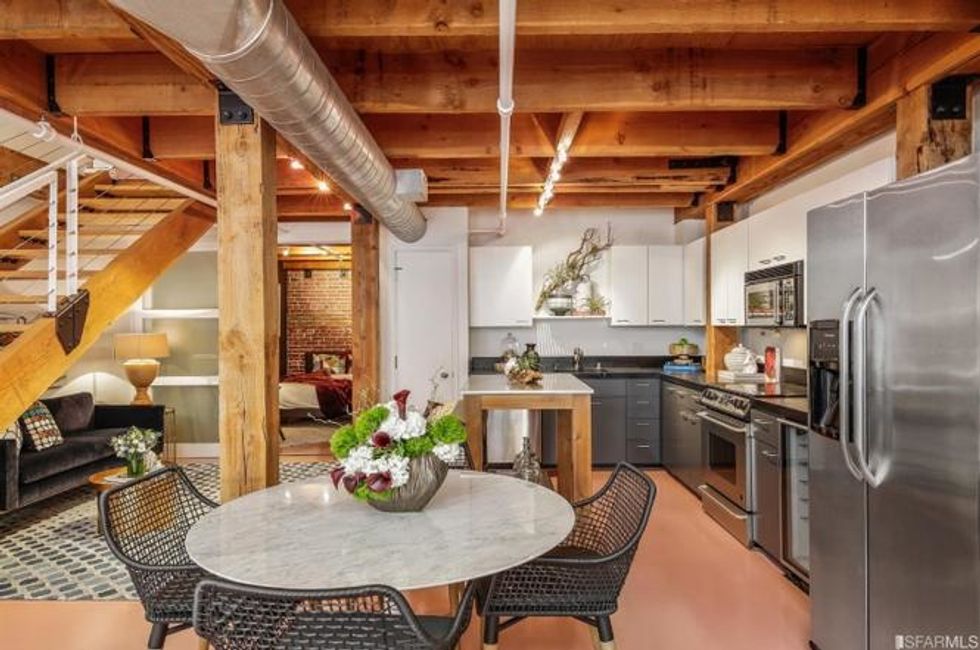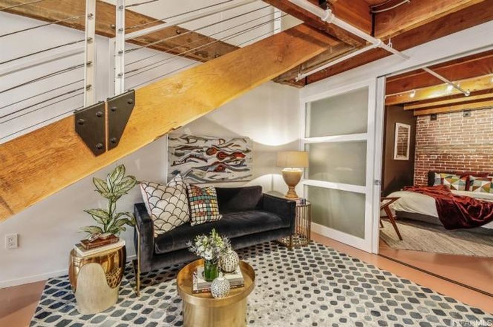 Contemporary art meets San Francisco's industrial past in this two-level, live-work loft with a custom, geometric rainbow mural by Austin-based artist Josef Kristofoletti.