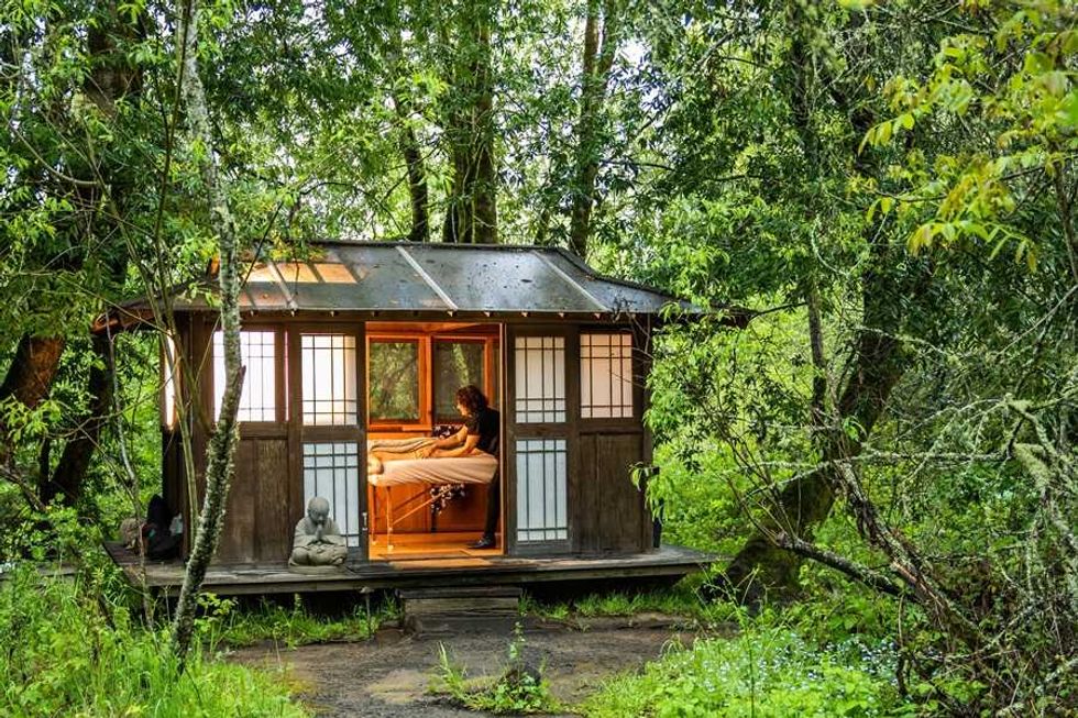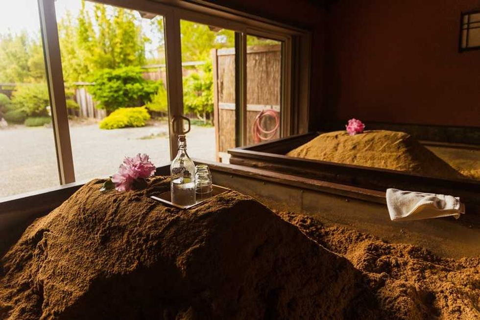 The therapeutic treatment dates back to 1940s Hokkaido but its origins are much deeper, rooted in ancient traditions in which mushrooms, seaweed, herbs, fruits, and vegetables were harvested to produce salves and tonics. Hinoki (Japanese cypress) is a sacred tree in Japanese tradition. When combined with enzyme-rich rice bran and a fungal “biological catalyst,” it ferments, generating heat that can reach temperatures of up to 150 degrees Fahrenheit. Fortunately for me, says Josh in our pre-bath consultation over steaming cups in the serene tea garden, the microorganisms in the recently refreshed bath haven’t reached such feverish heights quite yet.