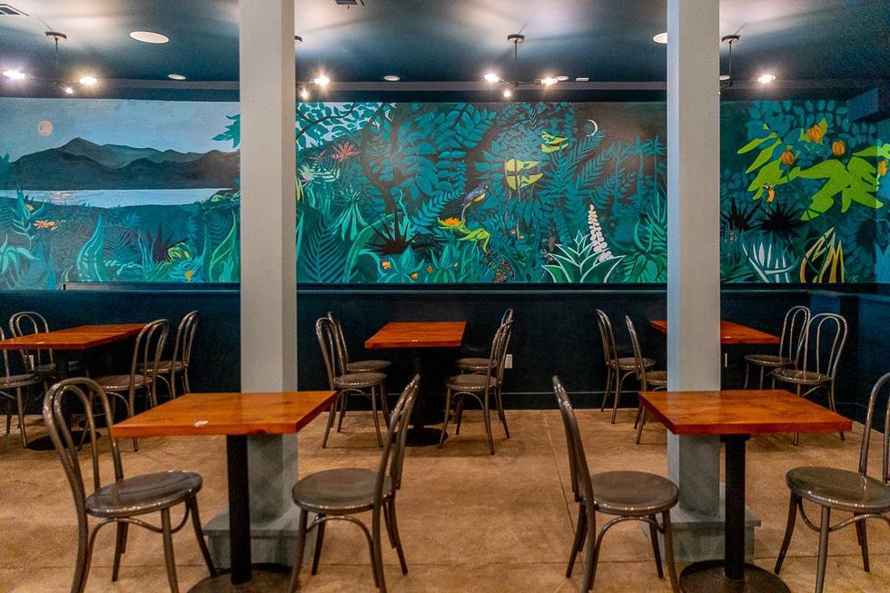The spirited design is the work of Son's Addition collaborator Dan Vickery, who washed several surfaces in watery aquamarine. In the back dining room, Rachel Sager, Anna's sister, painted a 54-foot mural inspired by Oaxacan landscape and wildlife in the style of Rousseau or Gauguin. Mexican paper art flutters overhead. All in all, the space is a "a modern interpretation of my family," says Chef Nick (formerly of Marlowe and Jardiniere). "The menu is filled with family recipes and the walls are covered with old family photos."