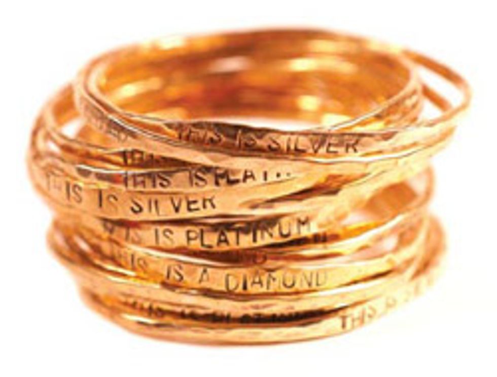 ![]() | KATE ELLEN METALS Kate Ellen has always liked tools, but the West Marin native spent years working at nonprofits before deciding to try her hand at jewelry. She started making accessories after taking a class at Oakland’s industrial arts studio The Crucible and quickly built out her own line. These brass, hammered bangles with stamped lettering from her fall collection are delicate but also add a little edge to any ensemble. $200 for a set of five at Hangr 16, 3128 16th St. (at Valencia), 415-552-5753, kateellenmetals.com |