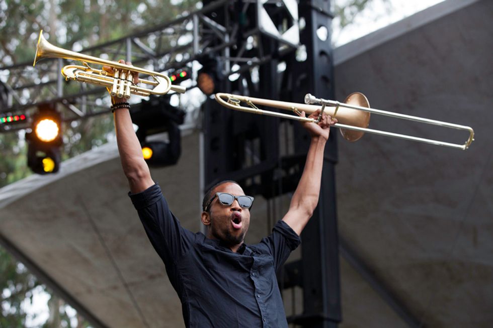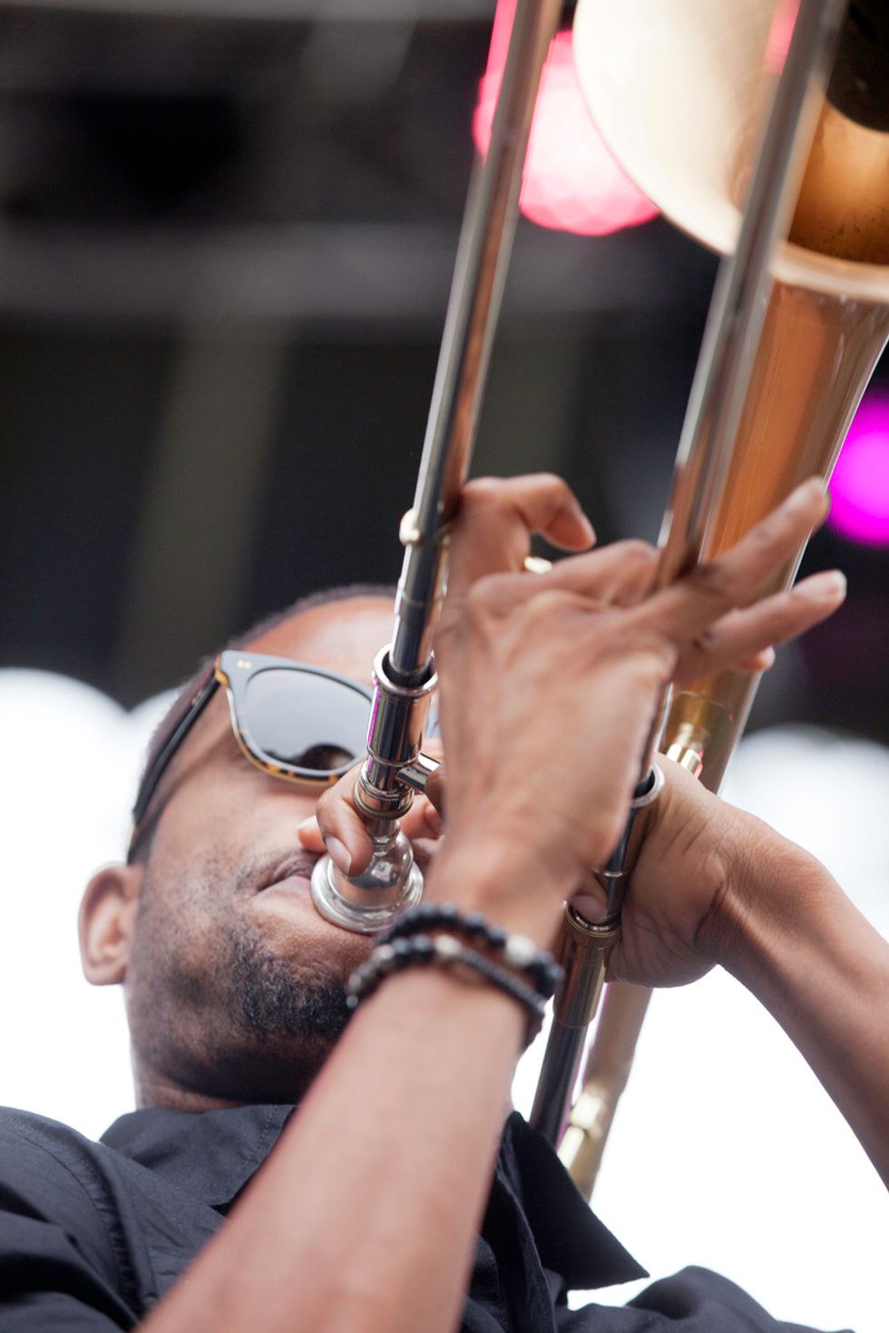Ivan Neville's Dumpstaphunk kicked off the day (loudly!) to an early crowd with beers in hand.