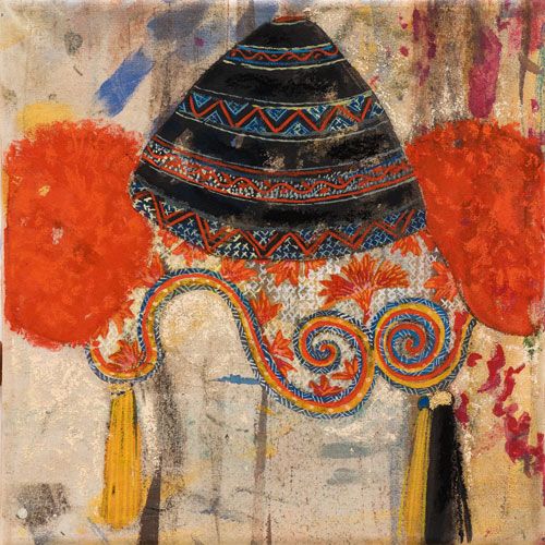 Isabelle de Borchgrave: New Paintings and Sculptures is a stark departure from the work shown at the Legion, a refreshing counterbalance to the monochromatic palette of pristine whites and the muted shades of regal and plebeian wardrobes. Here, vibrant colors, tribal patterns, and rich textures reflect the influence of extensive travels and appreciation of ethnic textiles. Bold works on paper are meticulously hand painted and then folded into an origami-like, accordion-style canvas. Elaborately painted life-size kimonos pose across from de Borchgrave's paper pleated Grecian dresses modeled after Fortuny's famous pleated silk Delphos gowns. And across from those fragile forms are dense corsets of worn patinas. Small scale sculptures of jewelry-like neckpieces are juxtaposed with larger-scale bronze works. All in all, it's a carefully curated display of the artist's range and unique ability to transform a common medium into the otherworldly. Givenchy puts it beautifully, "Isabelle is one of a kind. She plays with paper as a virtuoso plays an instrument."