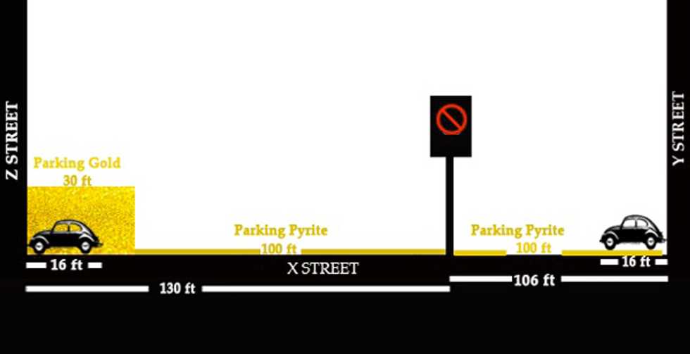 In your first example, the sign is 106 feet from the corner. Parking Gold? Nope. Parking pyrite. Why? Because you forgot to factor the length of your car into the equation. Once your car is parked on the street, the measurement will be from your car to the sign. Unless your car is less than 6 feet long, this spot is fool’s gold. Great spot for a motorcycle or scooter though. Let’s check out the other measurement down the other end of the street. You have 30 feet of gold to work with. Unless your car is longer than 30 feet, this spot is 99.999% pure California parking gold!
