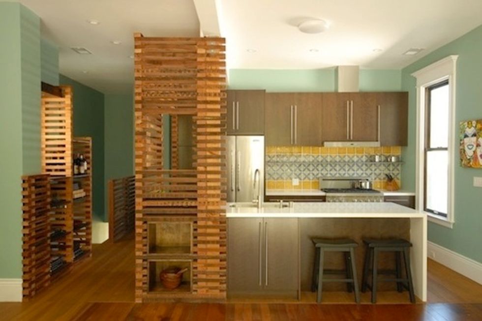 In the hallway leading to the open-plan kitchen, living room, and dining room (a space that was once divided into five smaller rooms), Tulley expounds on the recycled wood with a wall screen and storage. "We decided that whenever we made an intrusion in the house, it would be modern," she says.