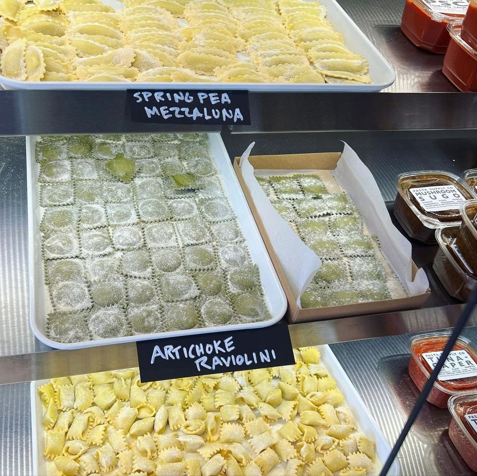 Inside Pasta Supply Co.—which is also what it sounds like, a retail space offering sauces, dried pastas, and pantry products—the 38-seat dining area, where service began on June 21st, has black wood floors, a wall covered in cork tile, and '90s hip hop on the sound system.