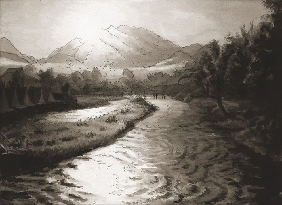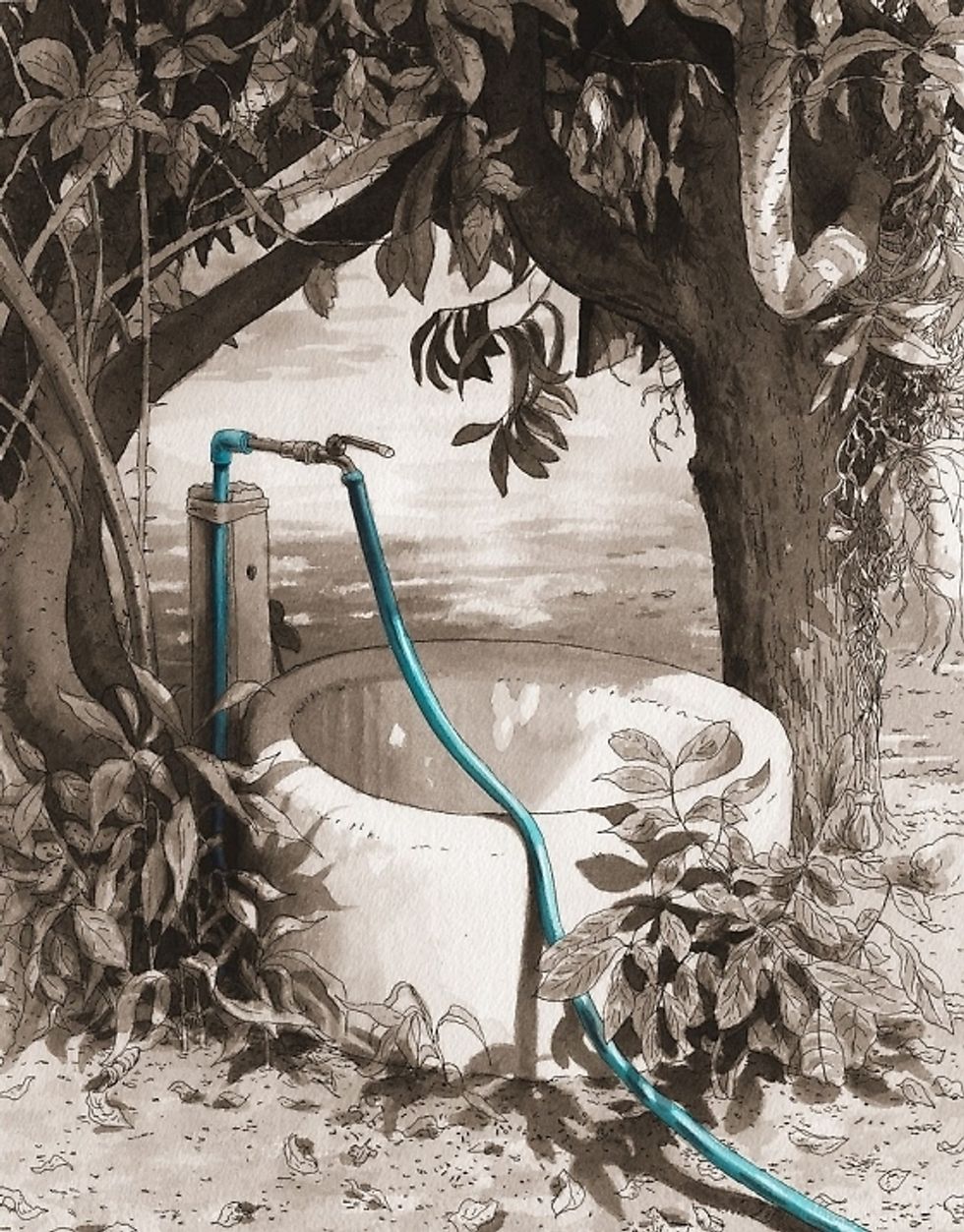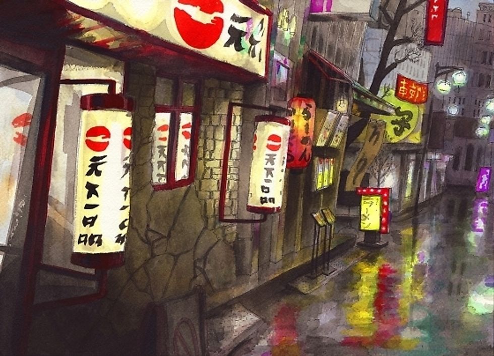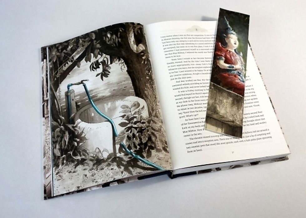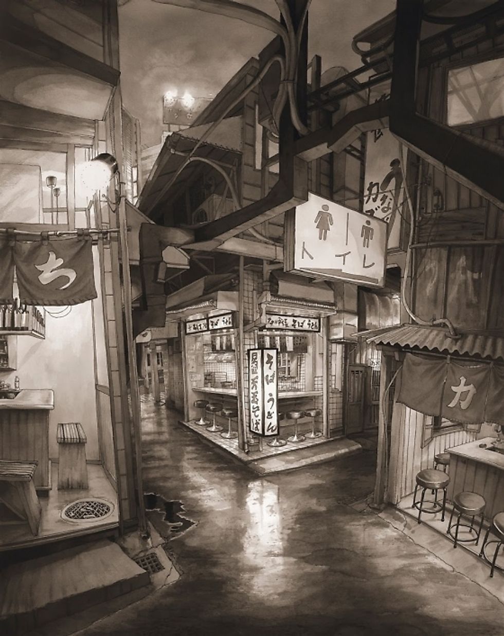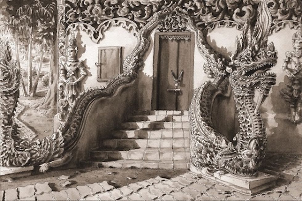 So, every year for six years beginning in 2009, Madonna traveled for a couple months at a time to Thailand, Japan, China to create the line drawings, on location, for all of the novel's 100 lush drawings of landscapes, facades, and interiors. Then, back in his SF studio, with the help of reference photos, he added depth to build up the emotional tenor of the drawings with India ink on cotton paper.