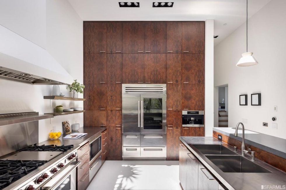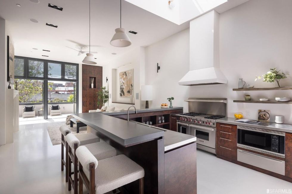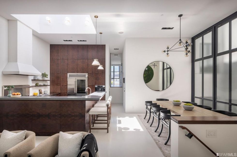 The main level is marked by floor-to-ceiling windows and a retractable skylight, illuminating the chef's kitchen. Find a wall of custom cabinets and stainless steel appliances nestled in a wraparound island with counter seating. Deep wood tones from this space are carried over into an accent wall in the living area, instilling synchronicity where one area flows into another physically and aesthetically.