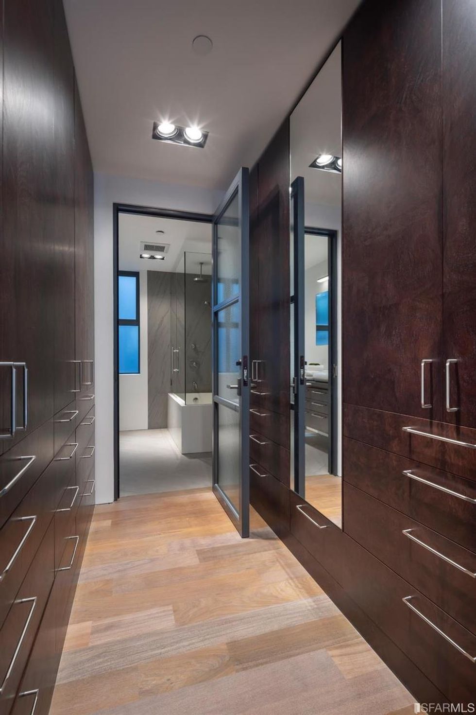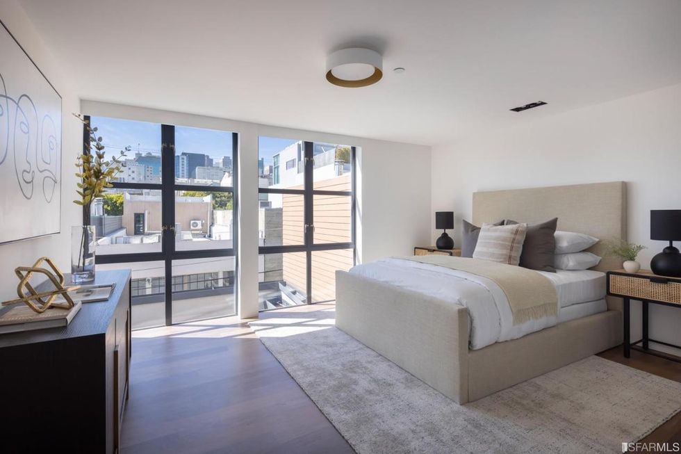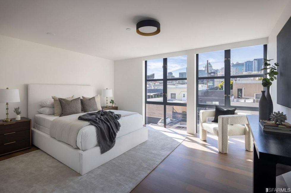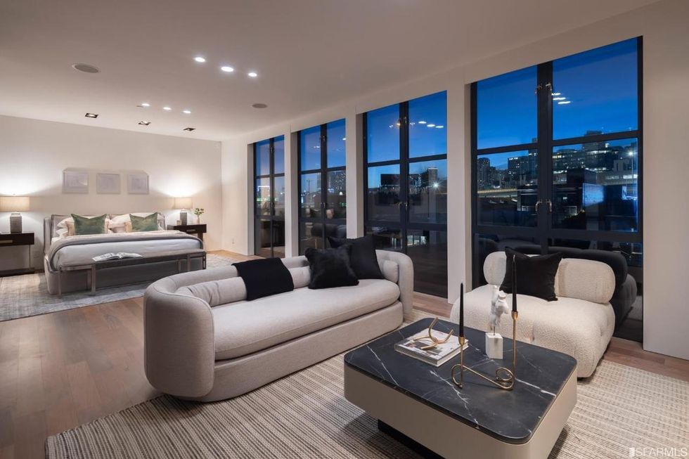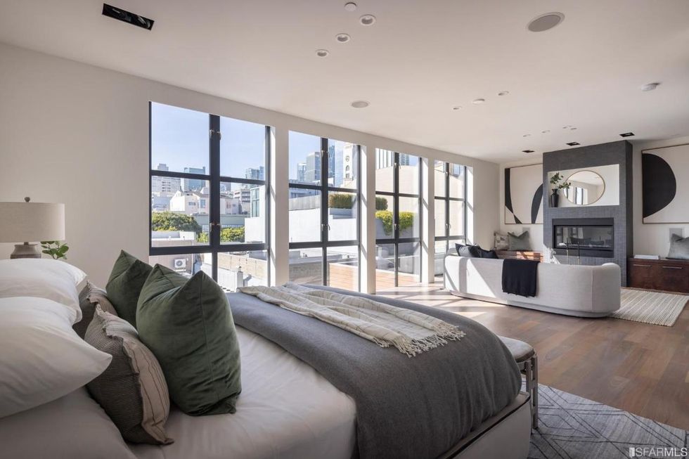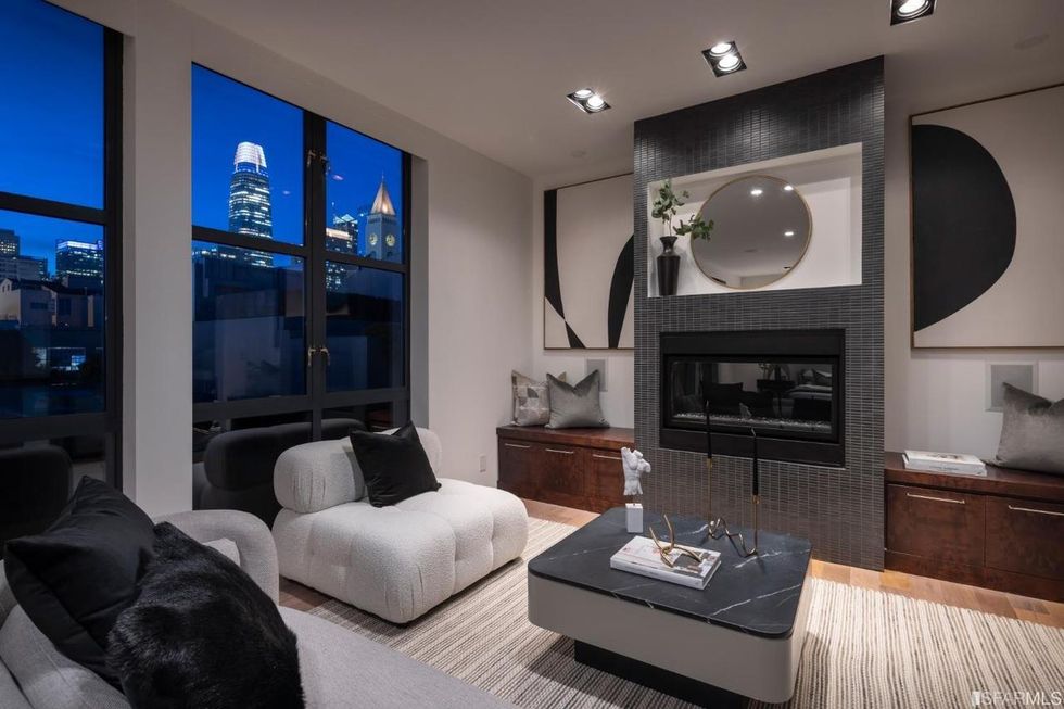 The primary suite has an expansive backdrop of the city skyline from the sleeping area across the room to the sitting space anchored by a fireplace flanked by cabinets with built-in seating. A walk-in closet and en-suite bathroom round out the master unit.