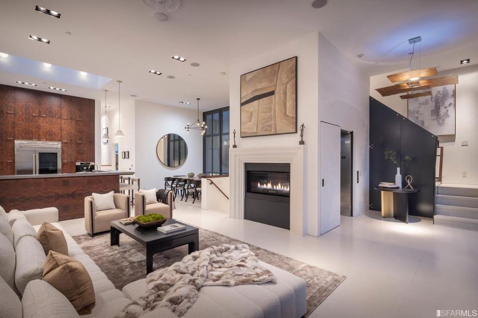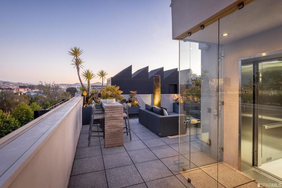 The crown jewel is the full floor roof deck with a fireplace and hot tub in an outdoor living area. Tuckered out from a soothing soak? Take the elevator down for a bite before bed.