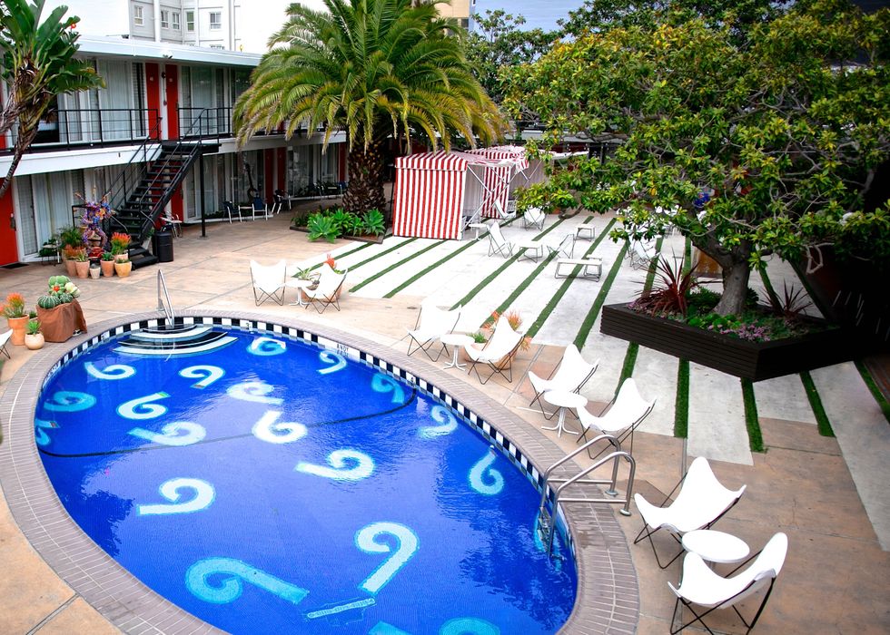 Over the next two decades, the hotel hosted touring musicians and creatives, drawing the likes of David Bowie and Kurt Cobain who like its low-key location within earshot of the Warfield, Bill Graham Civic Center, and Great American Music Hall (not to mention its convenient, tour-bus-friendly parking lot). In the '90s, Conley commissioned artist Francis Forlenza to create a mural in the bottom of the pool, not knowing that state law required all swimmable pools have a plain white bottom; the masterpiece is not only the property's centripetal force, but it's also one of just two landmarked swimming pools in the country.