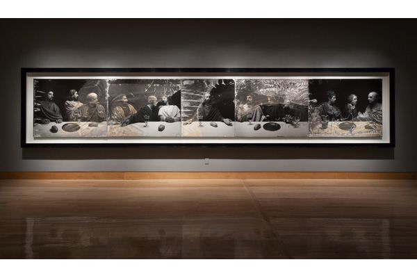 The 24-foot mural, which consists of five large panels, hangs alone in the dramatically lit first gallery. The images are photographs Sugimoto took in a Japanese wax museum, depicting Leonardo da Vinci’s “The Last Supper.” It portrays the apostles as they react in a wave of emotion to the moment when Jesus reveals that one of them will betray him.