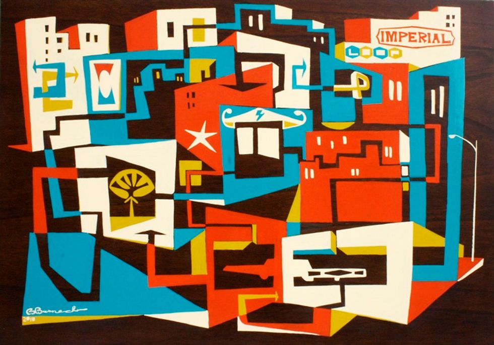 On September 16, 2010, Brian Barneclo, the famed muralist whose cubist-inspired works adorn the walls of many a SF hot spot (Nopa, Rye, District, to name a few) presented new works in a show titled "Looped" at the W Hotel to benefit his Systems Mural Project, a community-funded 600 foot mural at 7th and Townsend in SOMA.