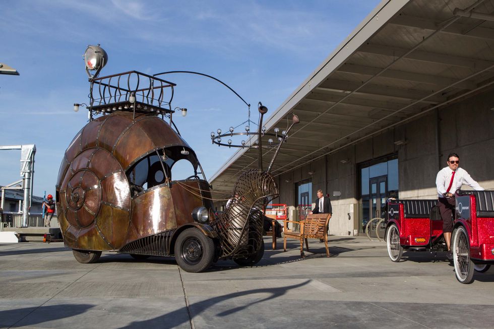 A fleet of whimsical chariots—including art cars in the shape of serpents and a giant snail by Oakland artist Jon Sarriugarte—whisked guests down the length of Pier 15’s Outdoor Gallery to enter the museum for cocktails in the East Gallery. A lavish sit-down dinner followed in the all-glass Fisher Bay Observatory Gallery with spectacular views of the bay and the city, with the sun making its slow descent, and the Bay Lights blinking in hypnotic patterns.