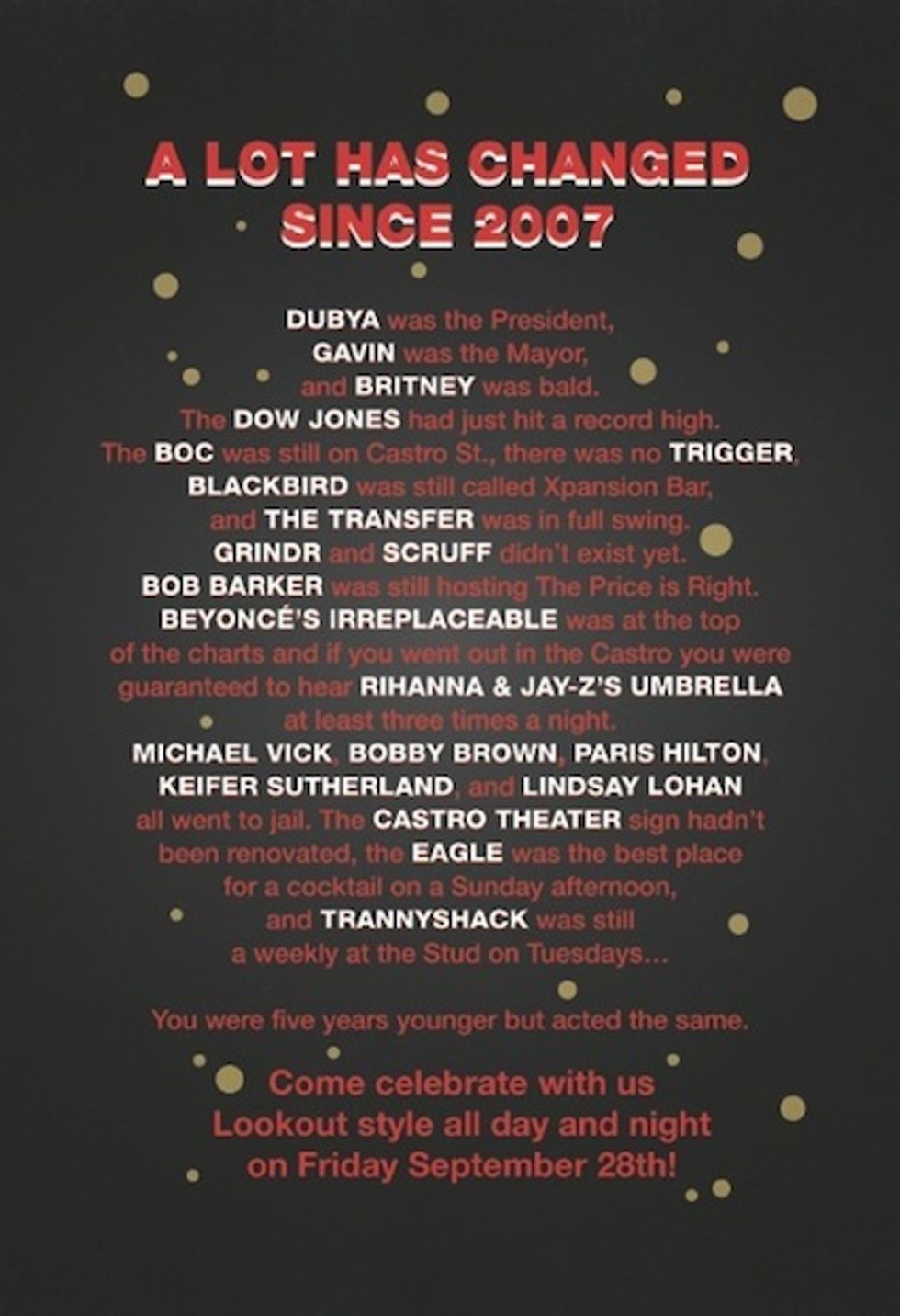 A lot has changed in five years (see below), during which Lookout firmly established itself as a fixture of nightlife in San Francisco, and embedded itself as a community institution, having raised over $350,000 for local organizations, and continuing to welcome residents and tourists alike to its now-iconic wraparound balcony.