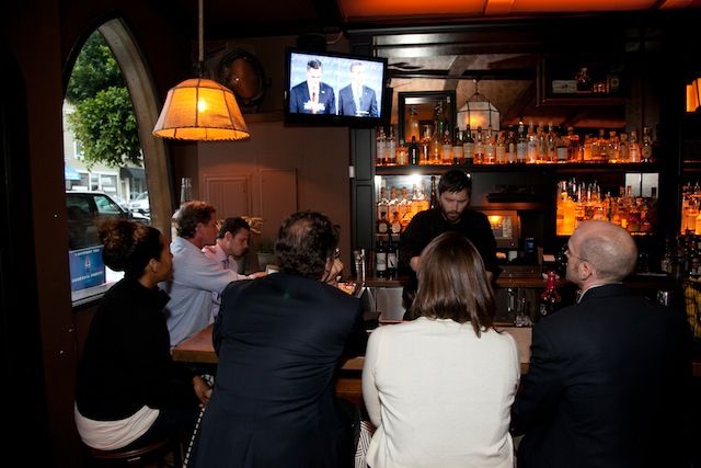 A packed crowd at Reed & Greenough watched the first presidential debate during Maker's Mark's Cocktail Party 2012