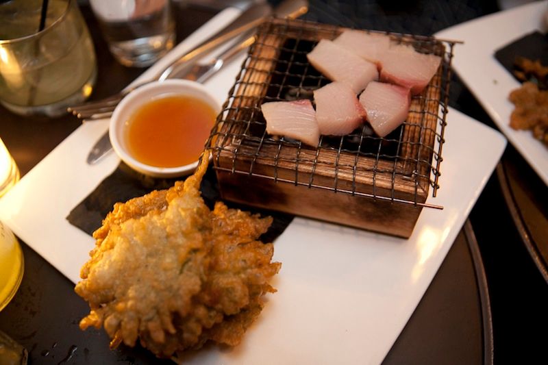 Smoking Hamachi with Buddha's Hand Ponzu and Tempura Shiso Leaves
