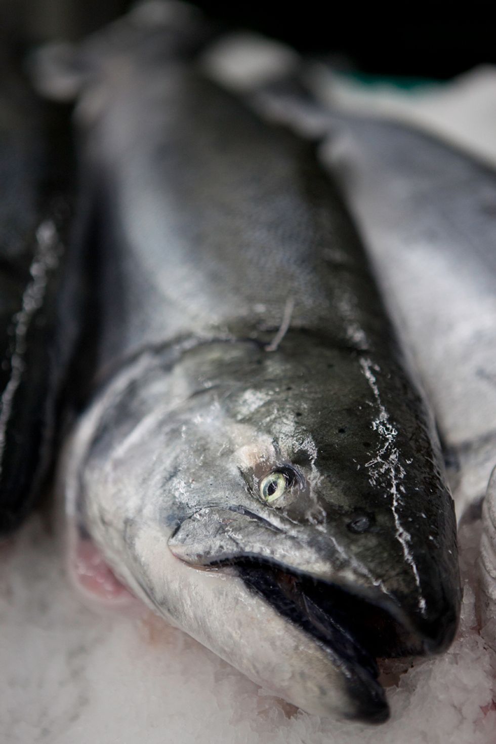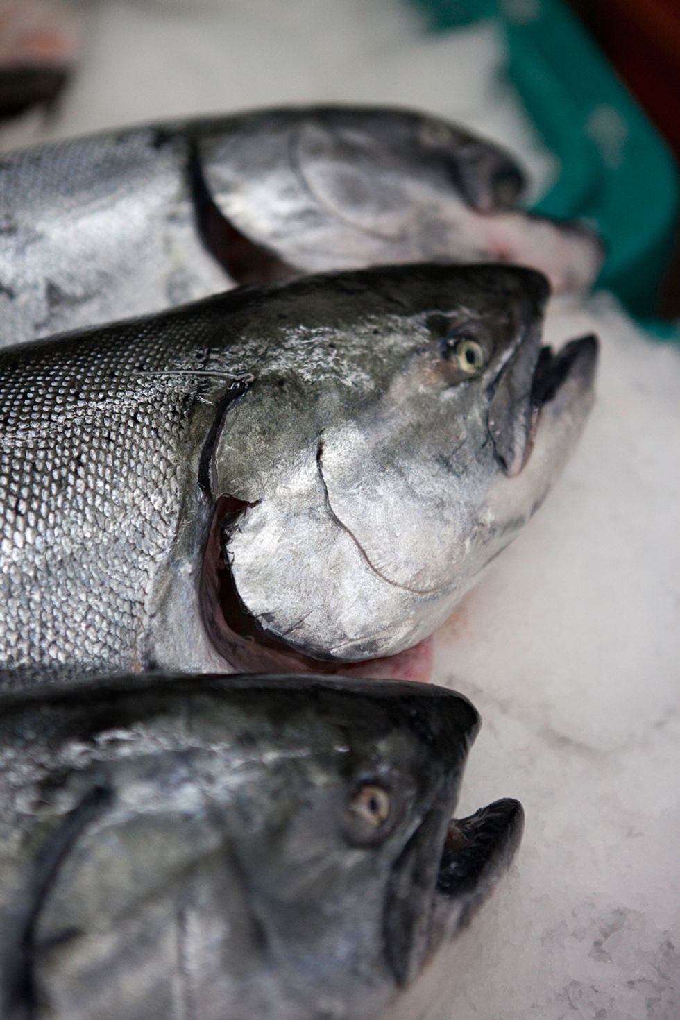 Salmon chill on ice after being unloaded from one of the many fishing boats at Pier 45.
