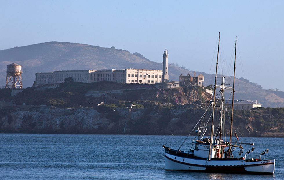 A fishing vessel passes Alcatraz on its way back out to sea.