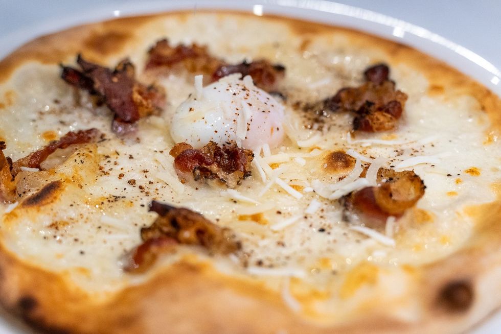 The pizza dough is made over several days using natural yeast and organic stone-ground flour imported from Italy, resulting in a sourdough crust that’s soft, crisp, and easy to digest. The menu features both red and white pizzas. Among the favorite whites are the Bronte—with fior di latte and ricotta cheeses and pistachio pesto—and the carbonara, a delightful poached-egg-topped take on the classic pasta. Red pies range from the perfectly simple marinara, one of Farouq's go-tos, to the specialty stracciatella, Batra's favorite.