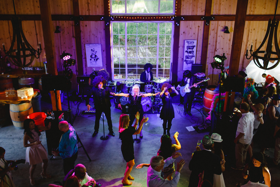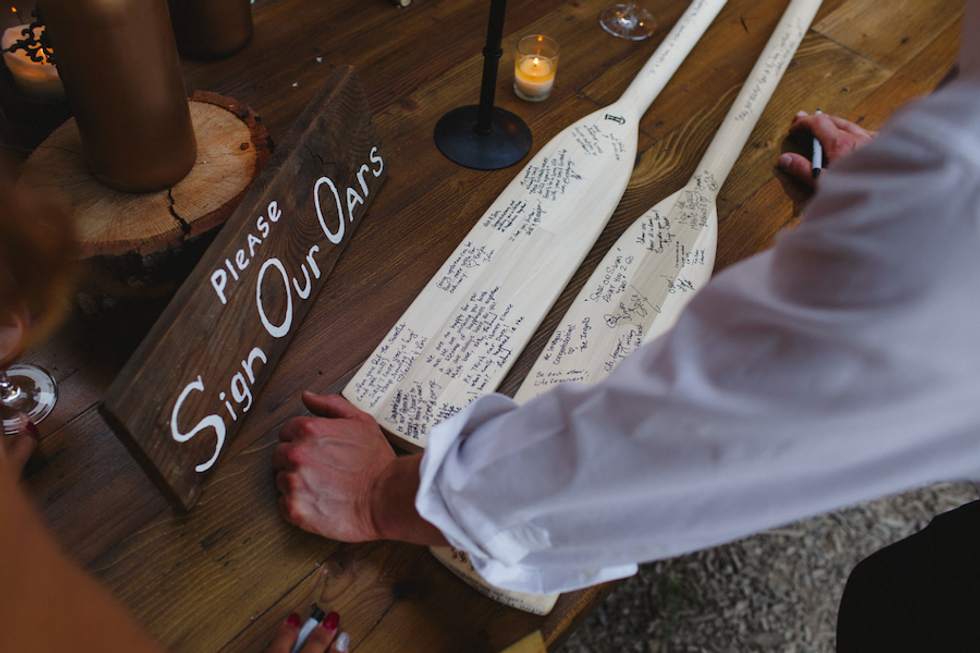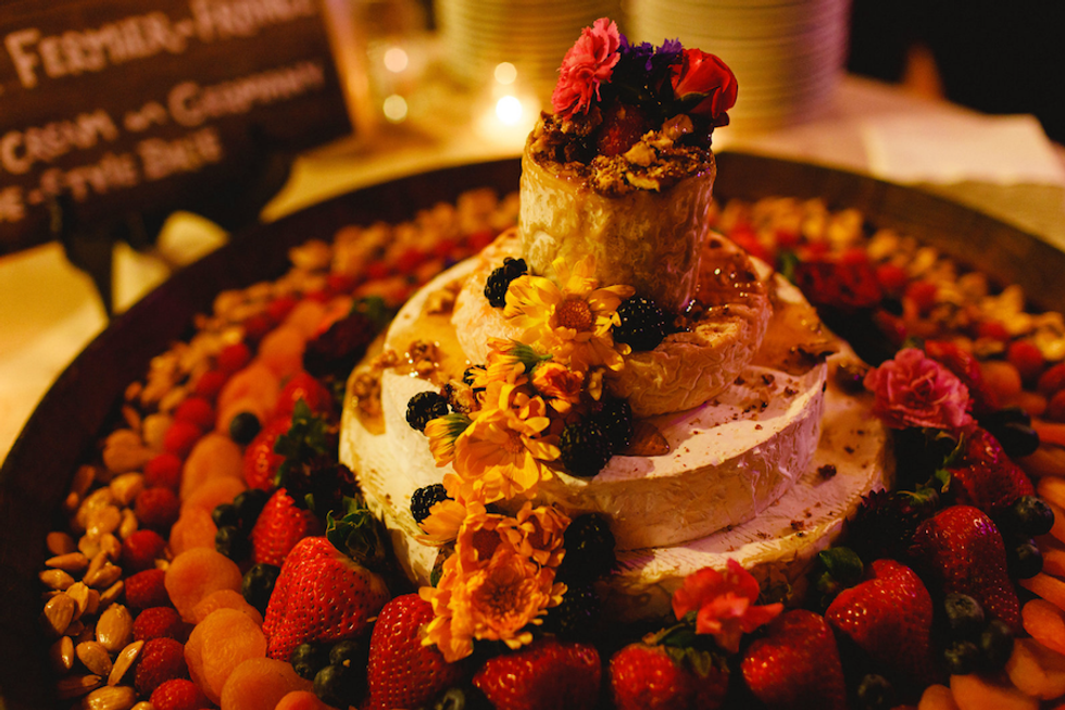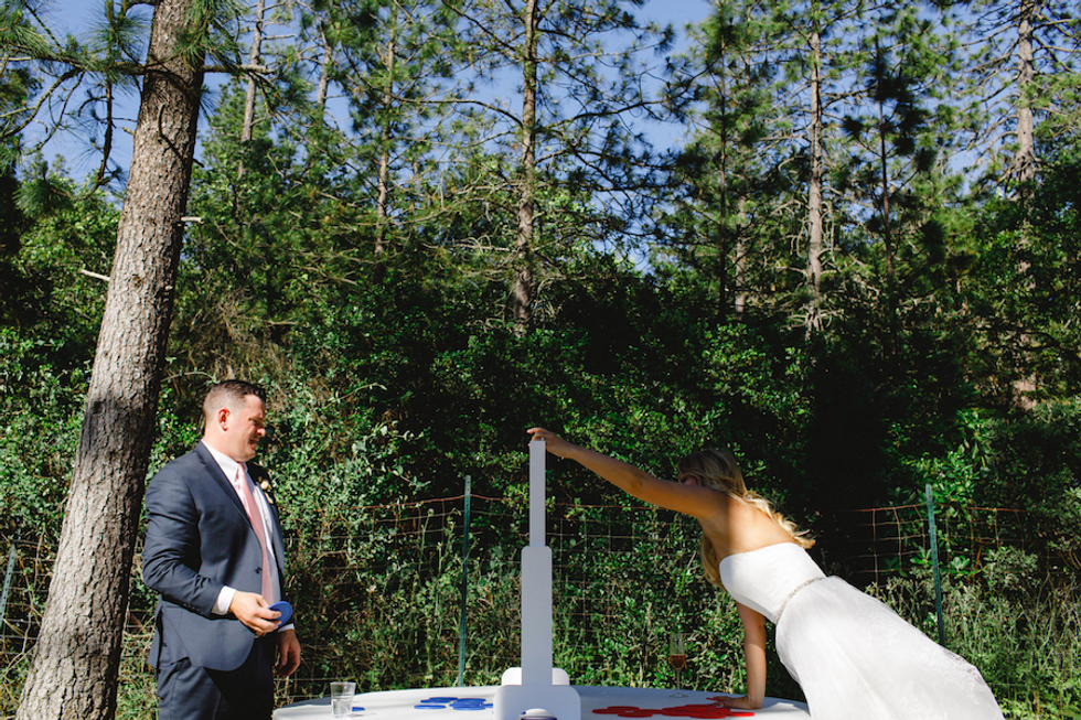The ceremony was personalized to a T: Empty bottles of wine the couple had drunk together doubled as centerpieces, and there was a giant version of Connect Four, Lander's favorite game. "I beat him every time," she brags. On the couple's second date, they capsized in a rowboat; at the wedding, guests signed commemorative oars. There was even an interactive paint-by-numbers made from a personal photo. Not fans of cake, the couple opted for cleverly stacked wheels of cheese, as well as an ice cream sundae bar. For an extra cozy touch, the flowers and food were provided by their friends.