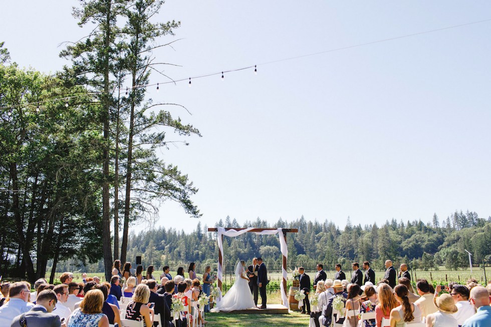 Hoping to share their Napa Valley life with their friends and family in an intimate setting, the pair chose a private Napa estate for their nuptials. But the day was years in the making—Reinell popped the question during a hot air balloon ride over the Valley back in 2015. The moment was a dream for Lander, who laughs, "He had five years to think about it."