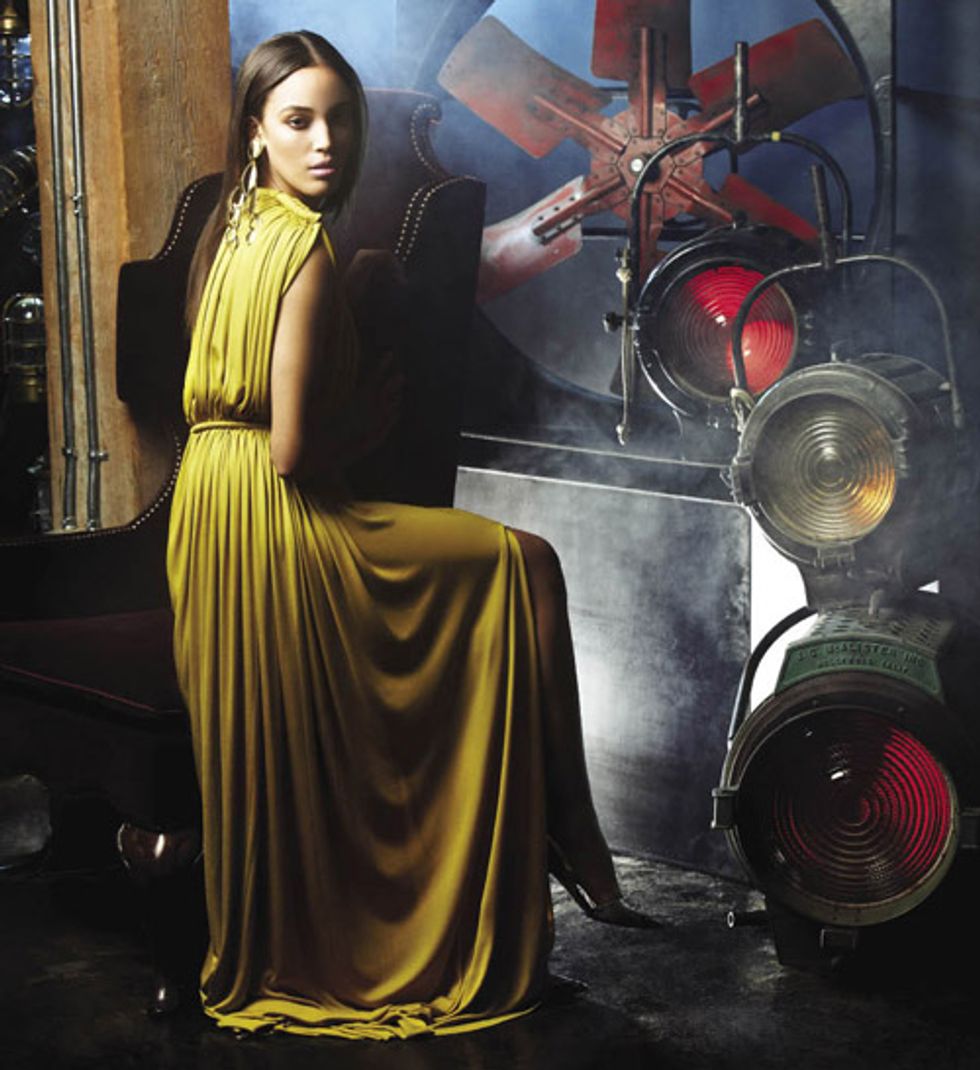 Lanvin rope-shoulder gown ($4,990), Stella McCartney faux-python slingback pump ($690), and Herve Van Der Straeten large dove earrings ($950) at Neiman Marcus, neimanmarcus.com. props: Large industrial fan ($2,000) and wingback chair in mohair ($17,550/pair).