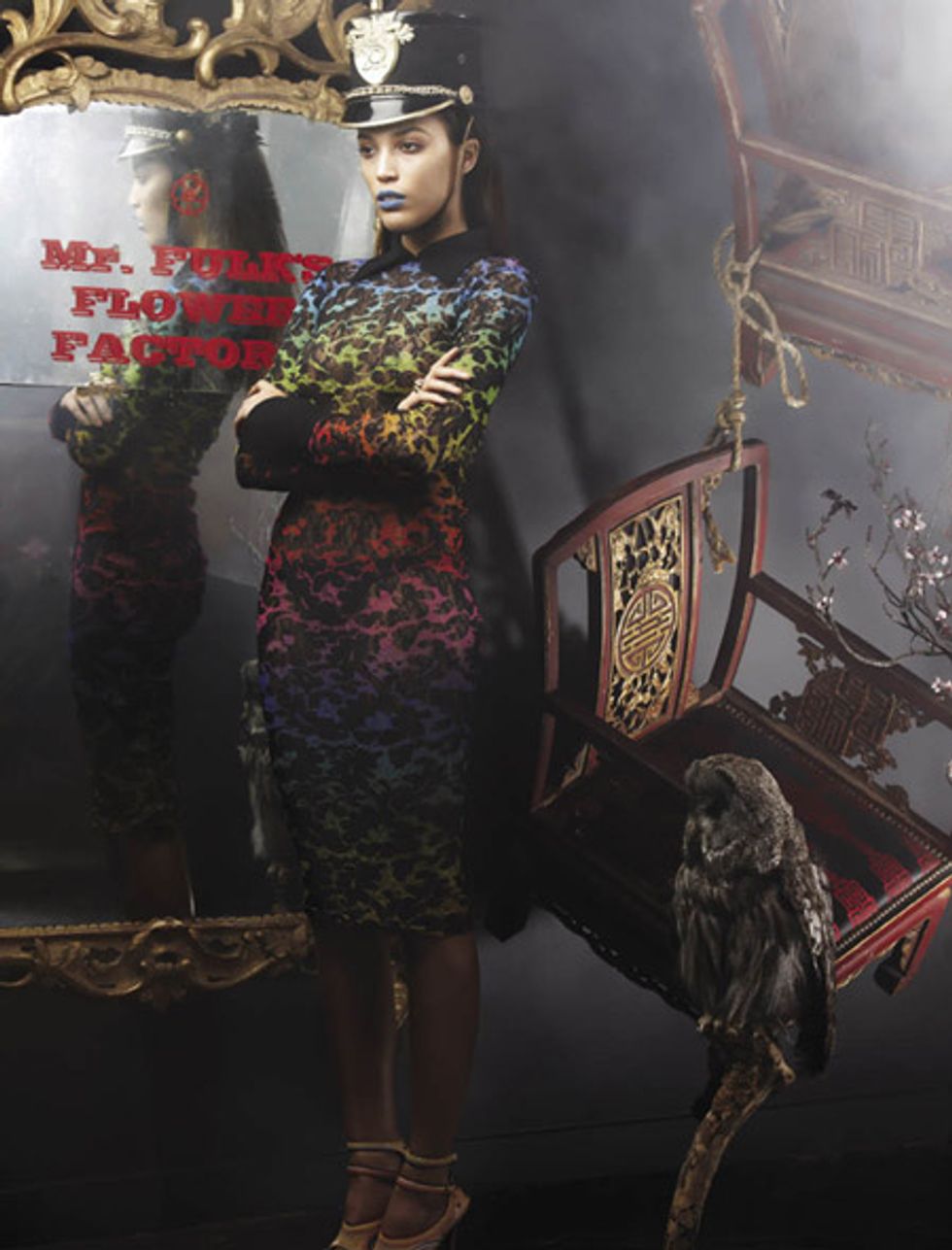 Christopher Kane lace dress ($1,230) at Neiman Marcus, neimanmarcus.com; Panthere Head Lakarda ring in yellow gold ($29,900) at Cartier, cartier.com; 1972 U.S.M.A. shako-style full dress cadet hat ($110) at Peep Show. Props: Louis XV gilt-wood pier mirror ($9,600) and pair of red carved chinoiserie chairs ($8,200).