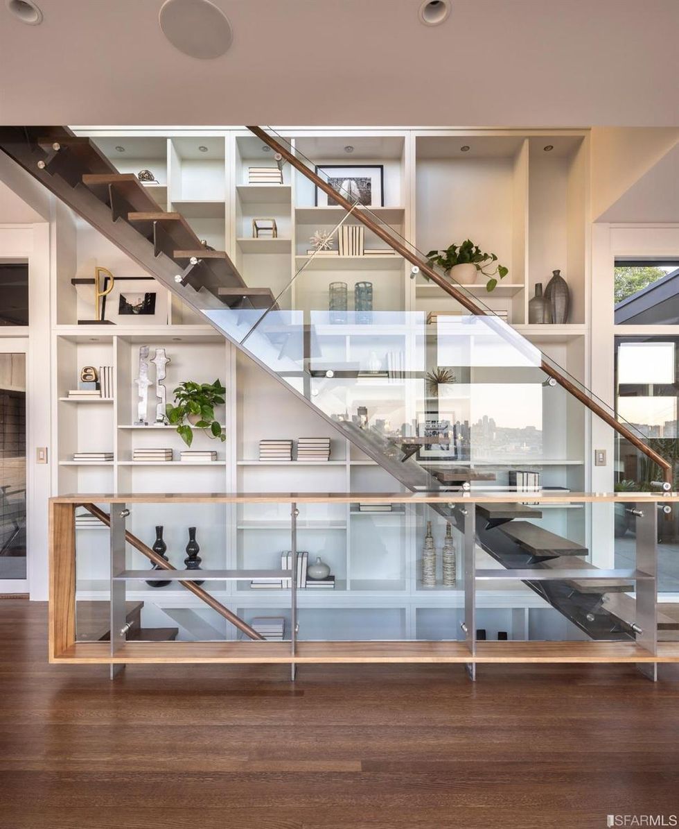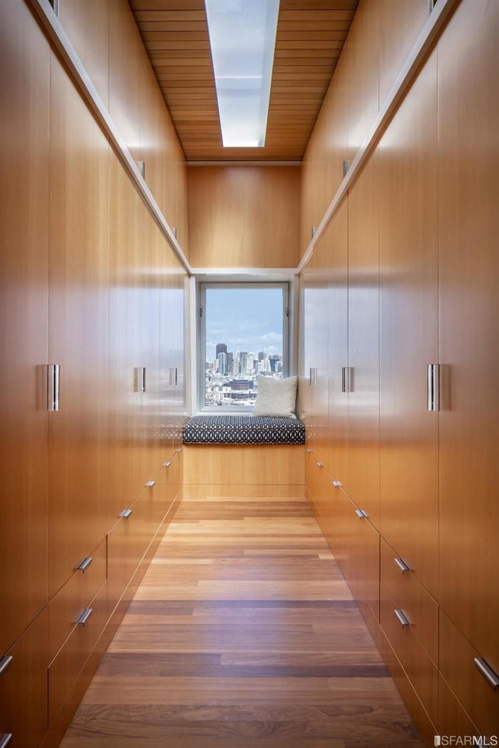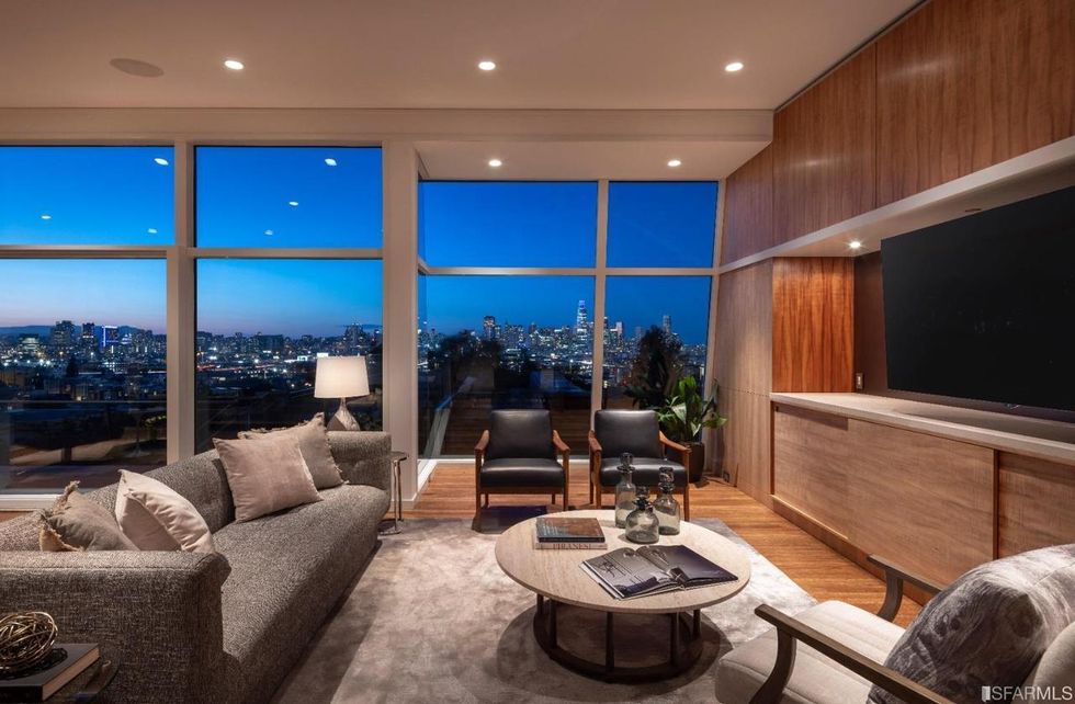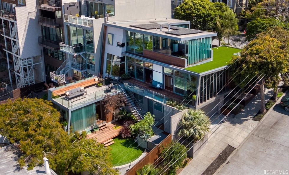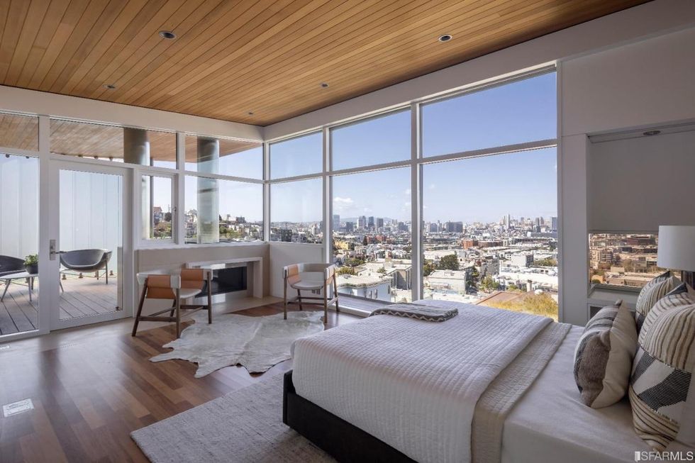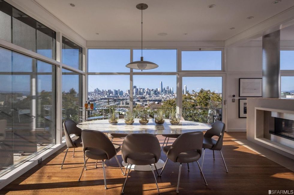 Spanning a double lot near Potrero Hill's North Slope, the residence offers panoramas of the city from Twin Peaks to the Bay Bridge. Find rotating vertical shutters that open to floor-to-ceiling glass walls for taking in the landscaped terraces and succulent gardens that surround the home.
