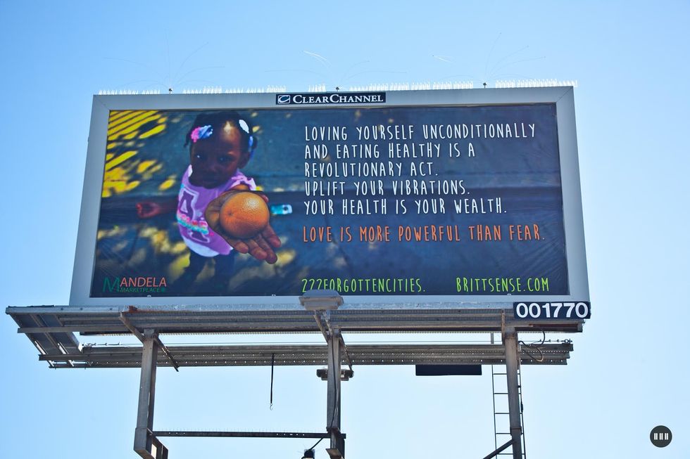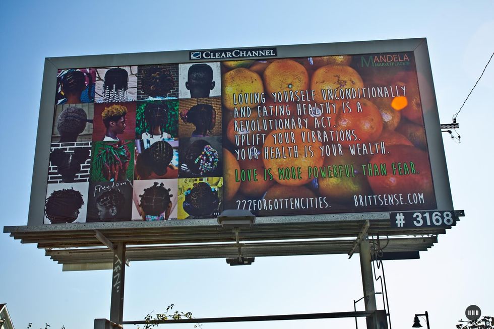 The results are inspirational billboards that stretch from the corner of 73rd and International in East Oakland to the West Oakland BART station. And while the missives are different on each board, their meaning is constant: Love yourself. Heal yourself. Love is greater than fear.
