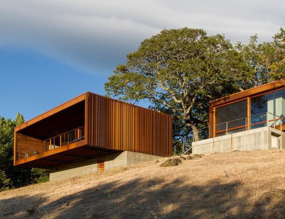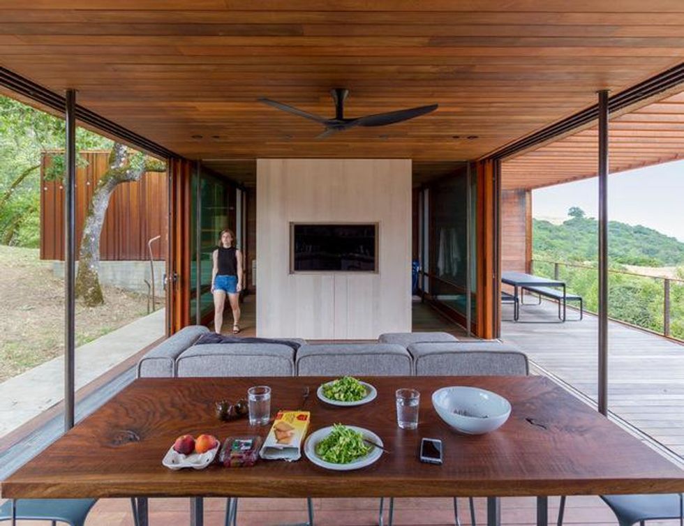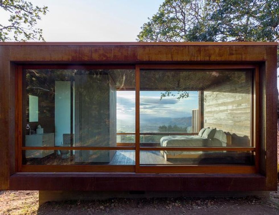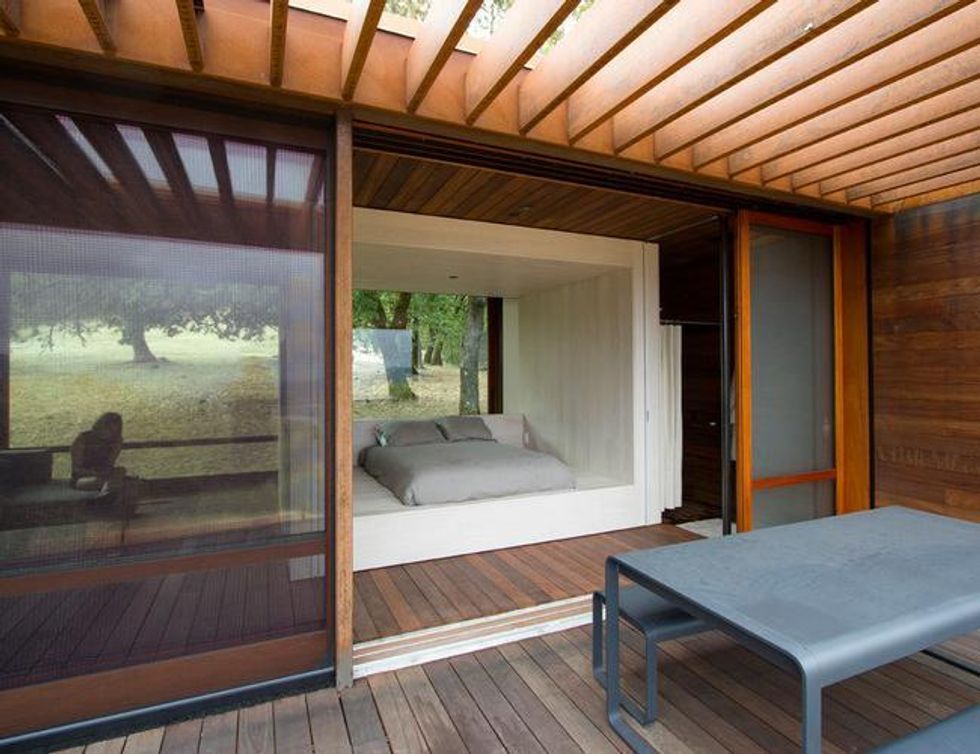 Jules' bed box within the main living unit frames views of the Sonoma Mountains. The deck has a sunscreen made from custom-folded steel rafters. The interior floors are also ipe. (Geoffrey Warner, original photo on Houzz)