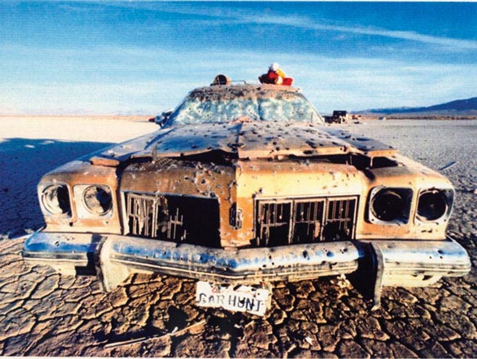 This klatch was the first theme camp at Burning Man, as well as the first of many weapons-based activities. Range control was enforced, so participating in a BARC outing was as secure as walking down the street. A few years later, we held the Car Hunt out on Blue Wing Playa in Pershing County, Nevada. Cacophony partnered with extreme-art cabal PeopleHater to reengineer and control remotely a 4,000-pound Oldsmobile Vista Cruiser station wagon and hunt it down using live ammo fired from moving vehicles. This looked very dangerous.