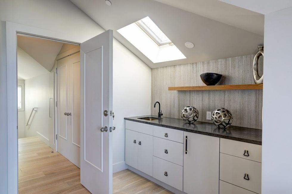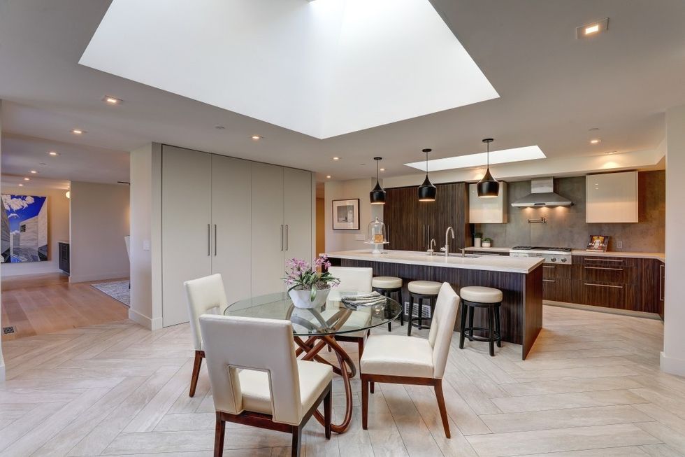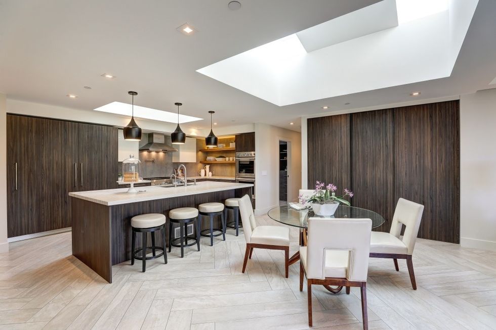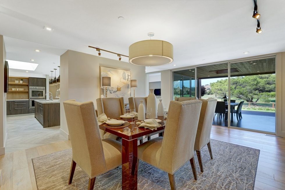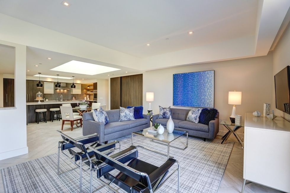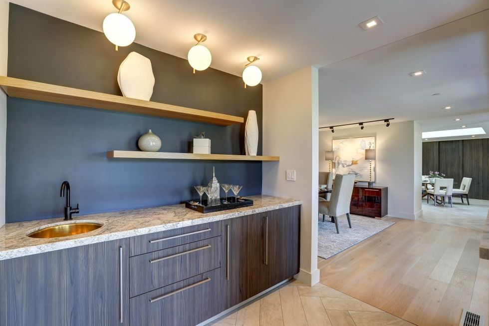 The floor plan was designed for grand entertaining and serious R&R. Intimate dinner parties can be held in the dining room with gallery lighting and glass doors that open onto an al fresco dining area. Ten foot ceilings, gas fireplace, and additional wet bar with floating shelves make up the formal living room for cozier affairs. Sweeping glass doors open up to the rear deck and outdoor living spaces for sun-soaked days.
