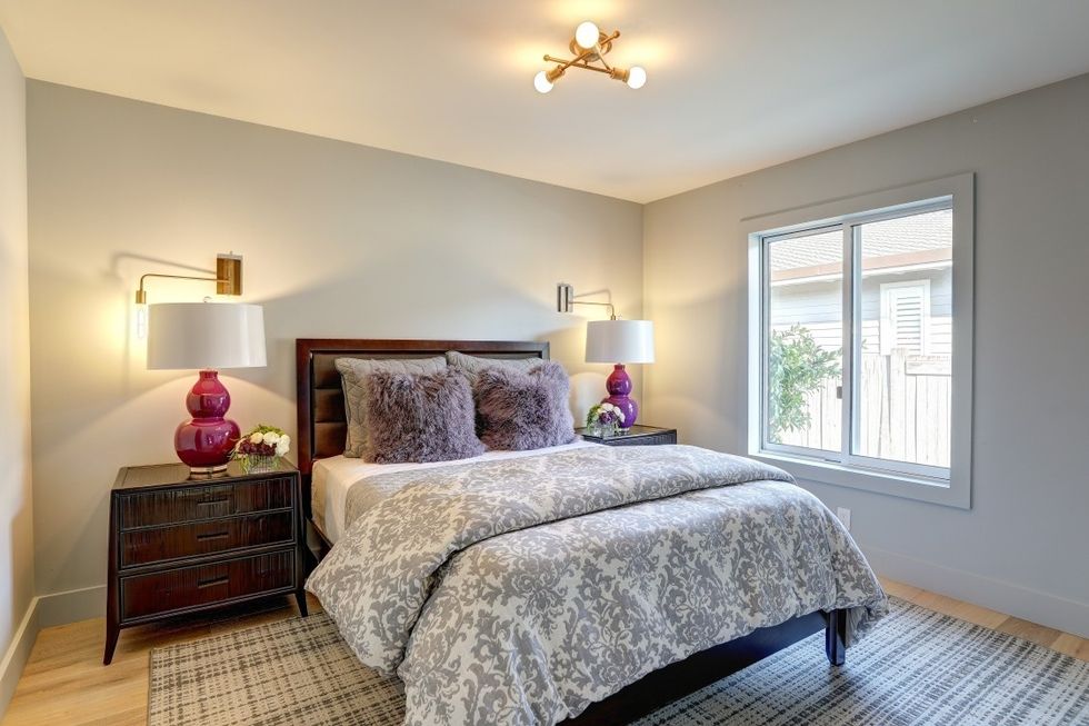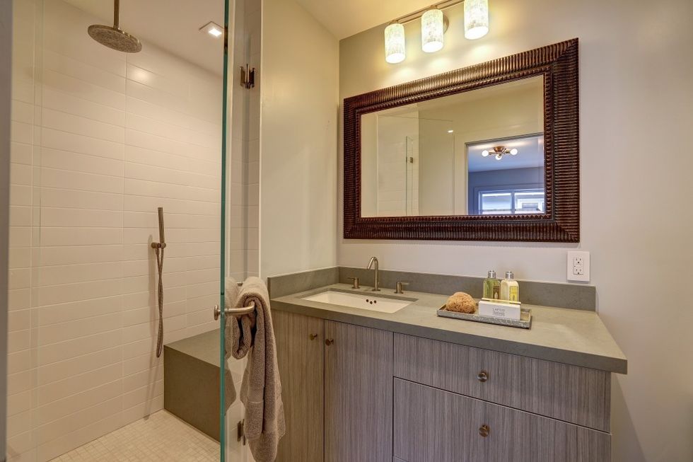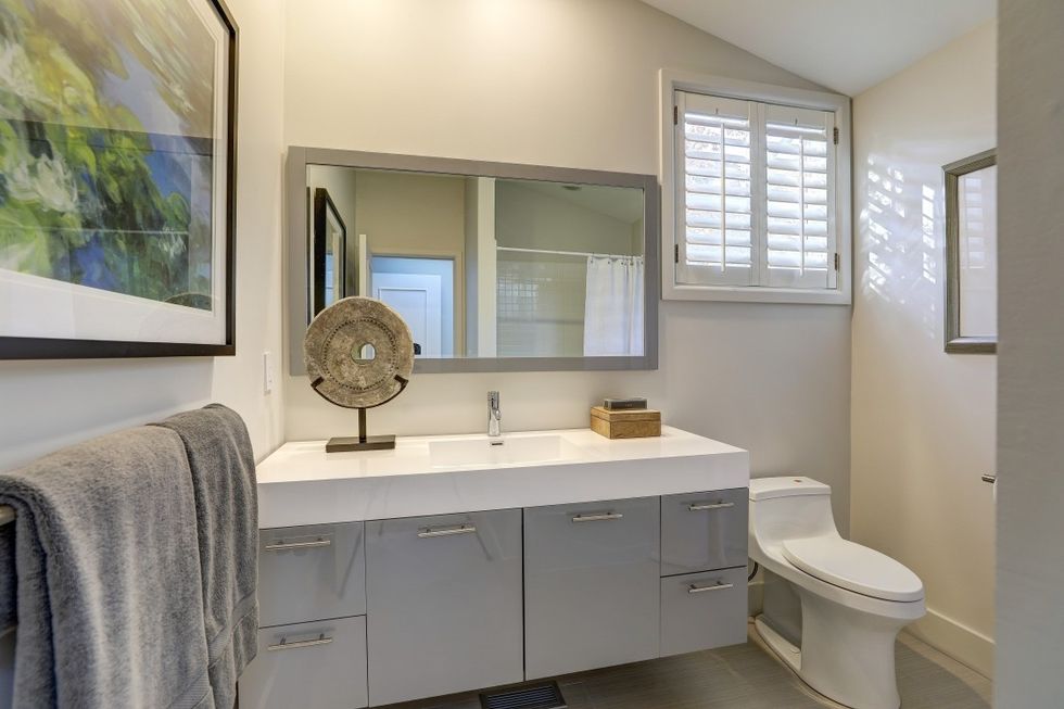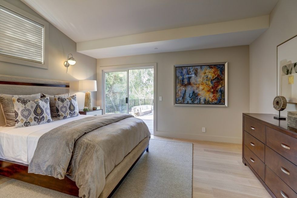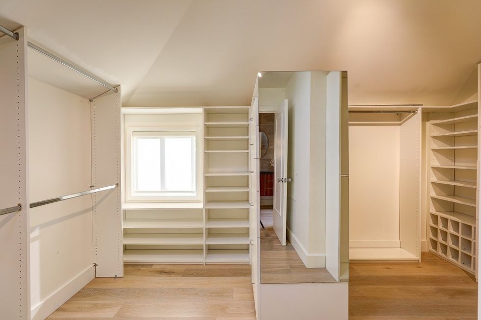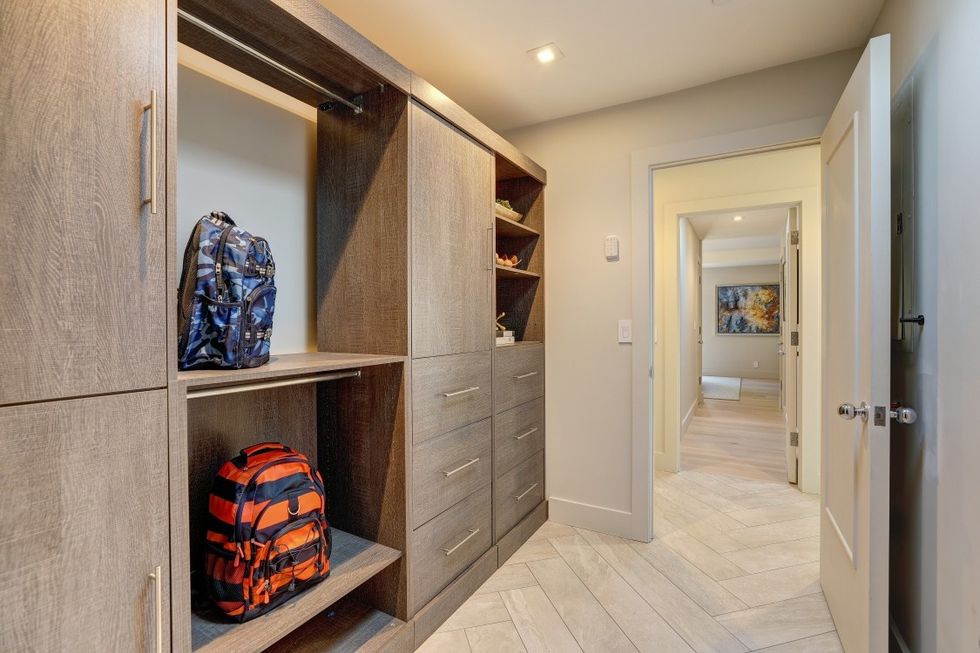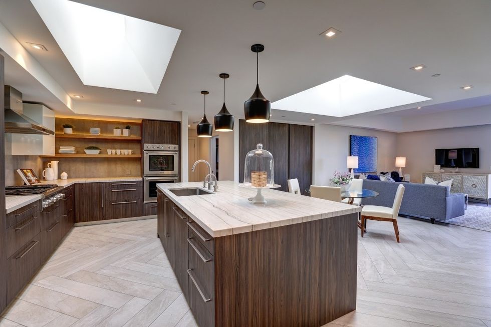 The floor plan was designed for grand entertaining and serious R&R. Intimate dinner parties can be held in the dining room with gallery lighting and glass doors that open onto an al fresco dining area. Ten foot ceilings, gas fireplace, and additional wet bar with floating shelves make up the formal living room for cozier affairs. Sweeping glass doors open up to the rear deck and outdoor living spaces for sun-soaked days.