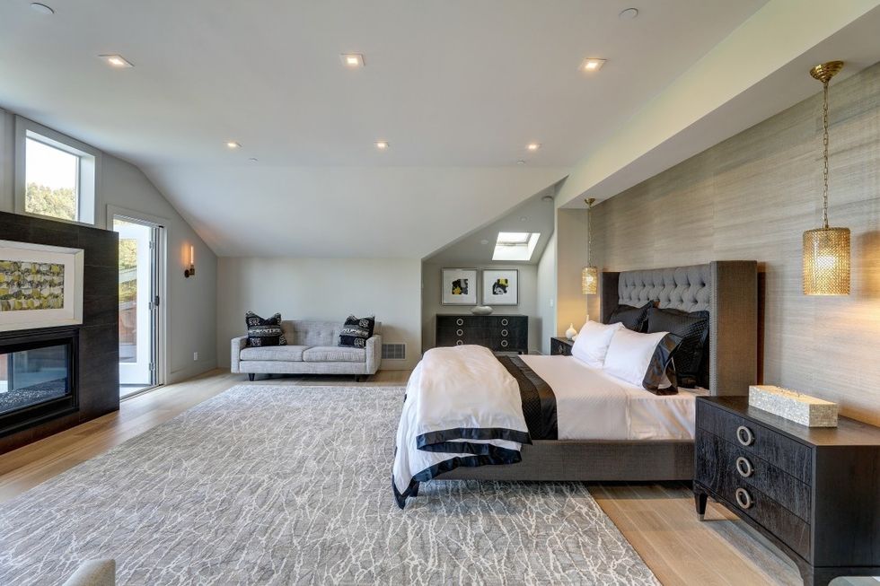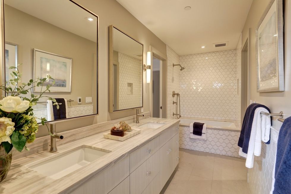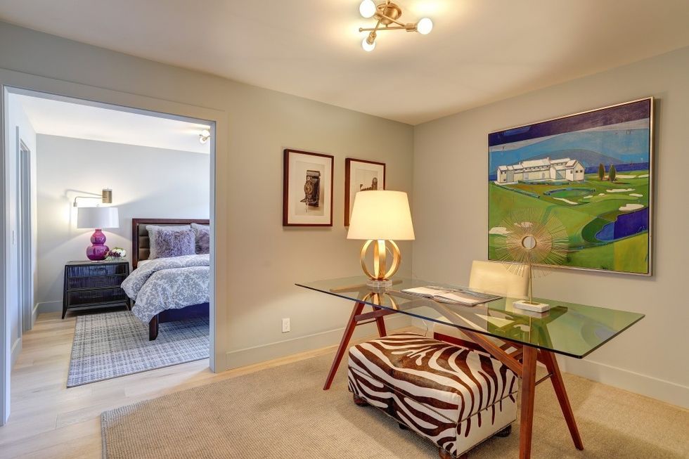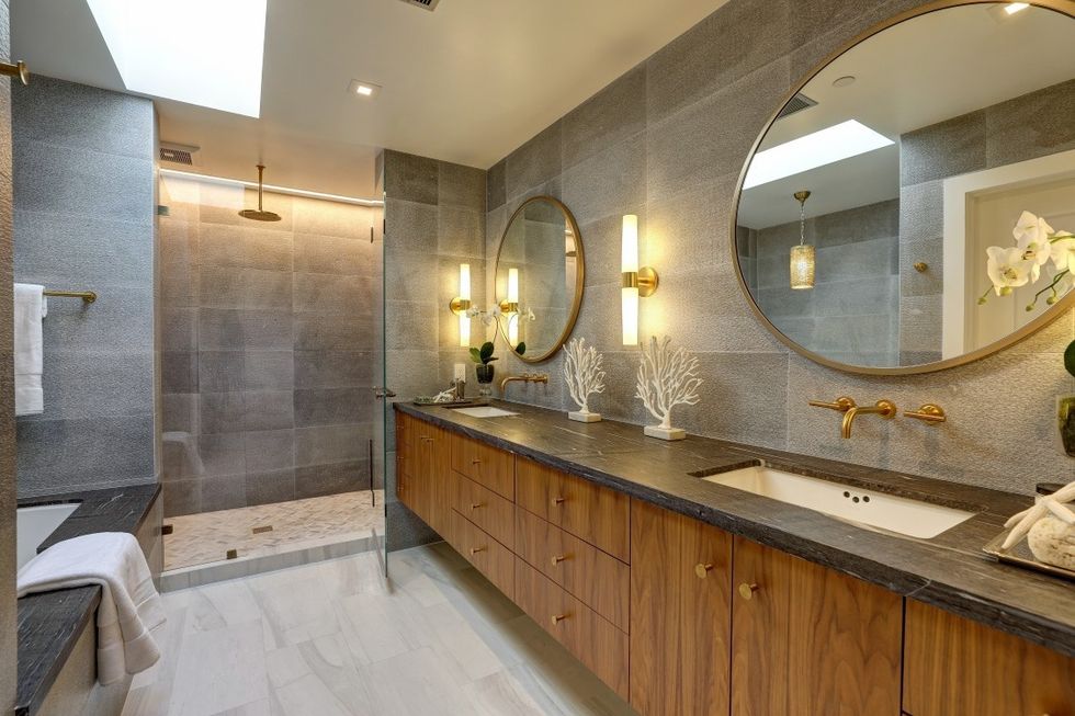 Upstairs, the master suite feels like a luxe hotel suite with soaring ceilings, an indoor/outdoor glass gas fireplace, wet bar, and private terrace—it's the perfect getaway for reading, lounging, or watching golfers practice their swing. The bathroom has a large double vanity with Walker Zanger hand-cut stone tile, brass fixtures, a Carrara marble walk-in shower, and a spa-style tub. The walk-in closet has custom built-ins.