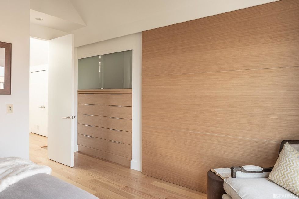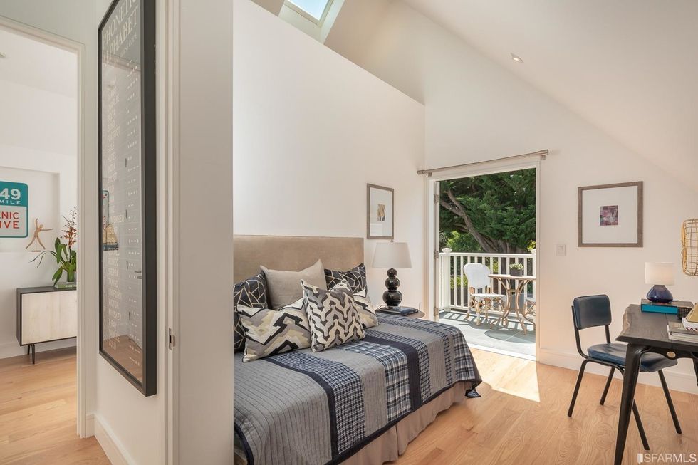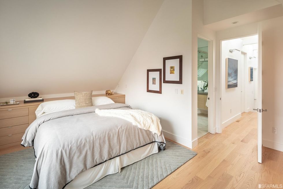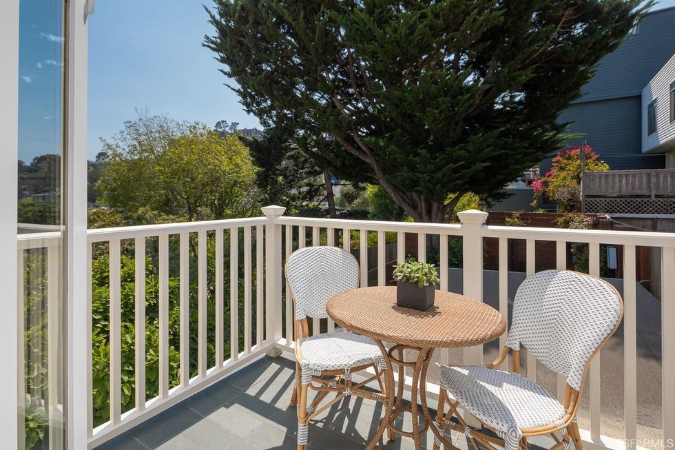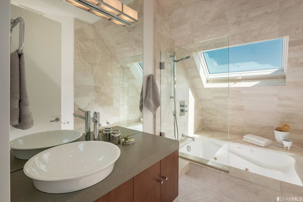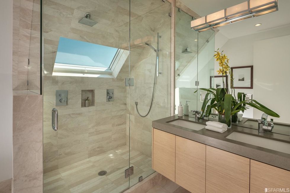 Upstairs, three bedrooms each have subtle contemporary charms: marble bathrooms with heated floors and floating vanities with double sinks and granite countertops. The hallway, flooded with natural light from multiple windows overhead, leads to the master suite, where a generous closet is hidden behind a sliding wood door and the bathroom has a jetted tub. Jutting off the back is a quaint balcony tucked into the treetops.