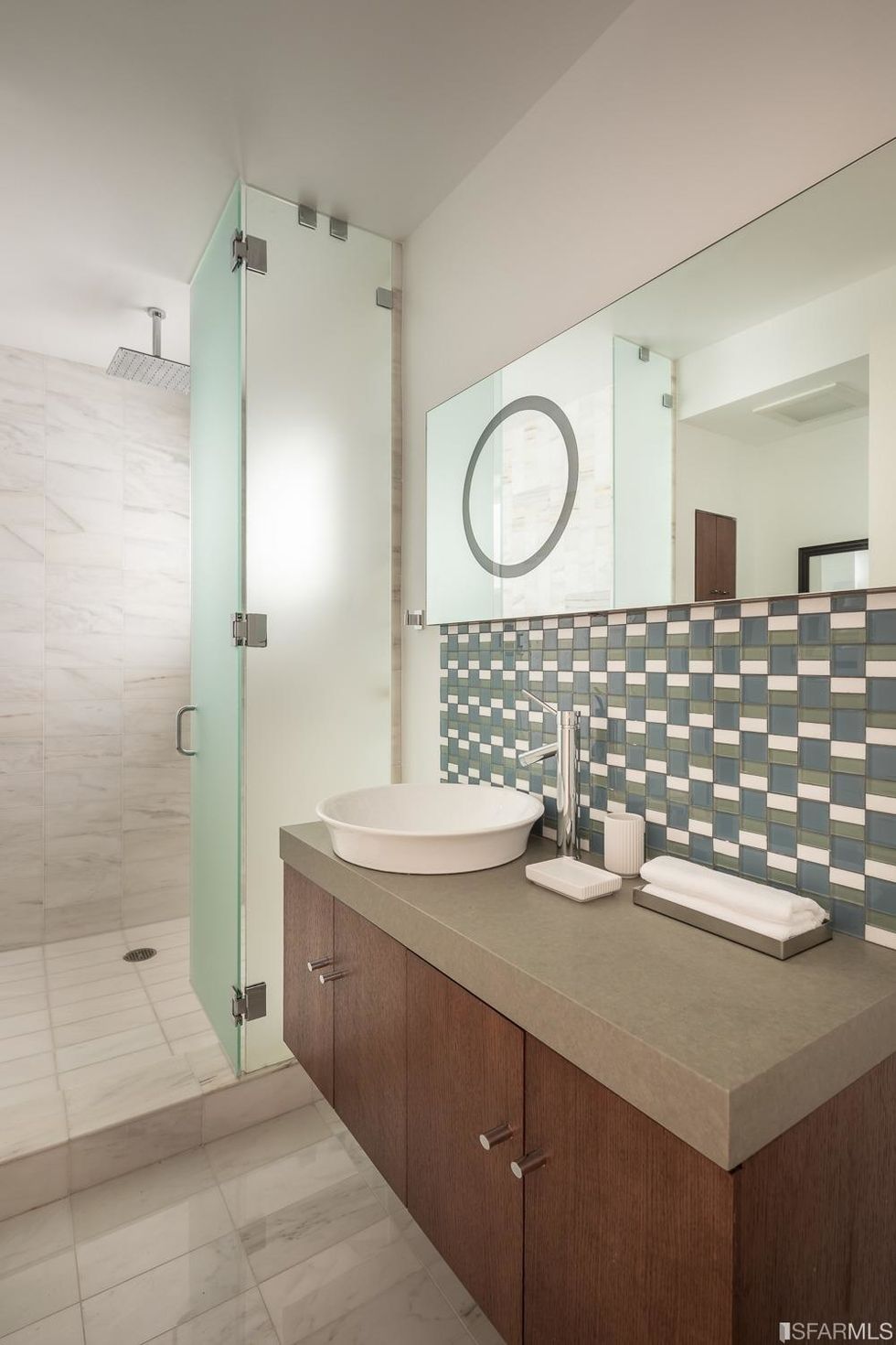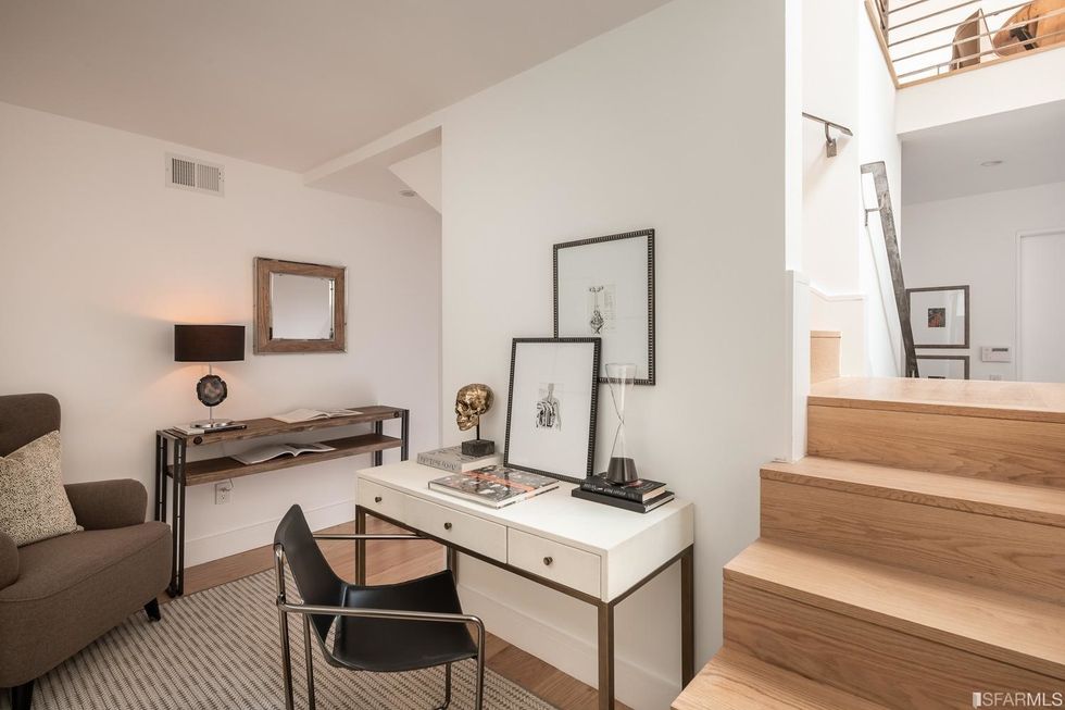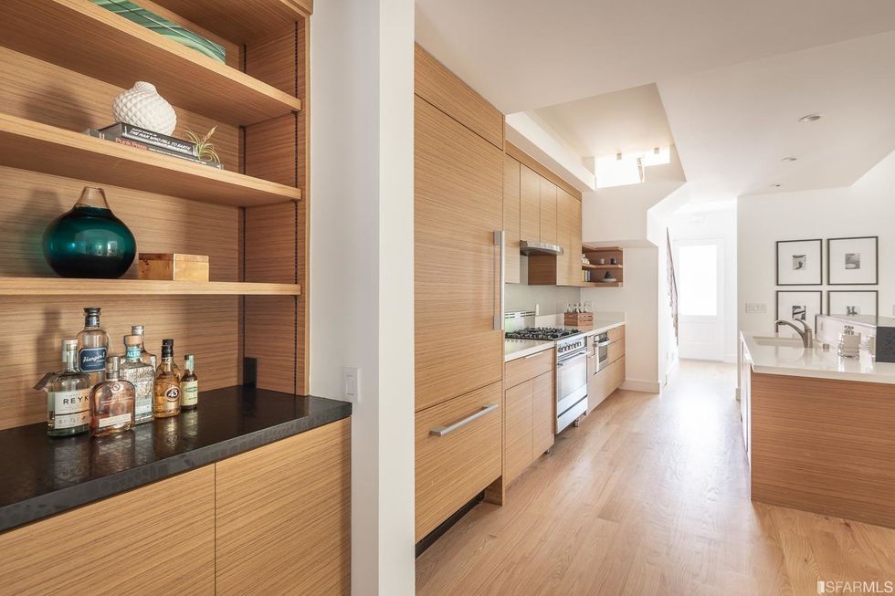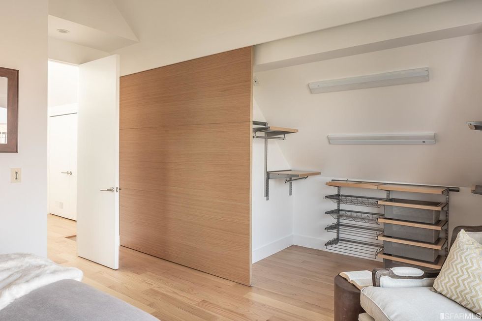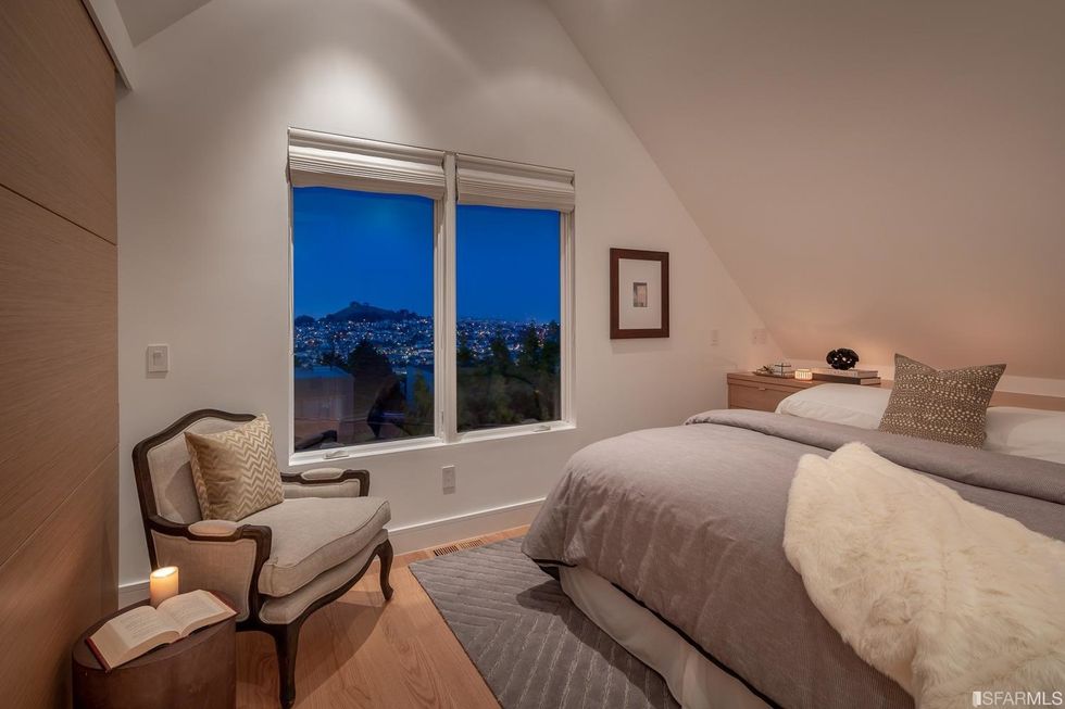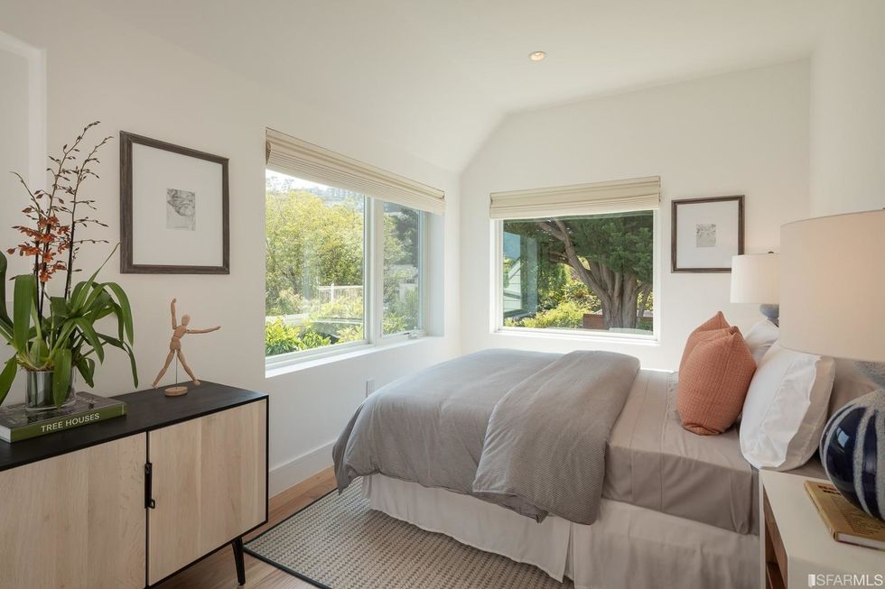 Upstairs, three bedrooms each have subtle contemporary charms: marble bathrooms with heated floors and floating vanities with double sinks and granite countertops. The hallway, flooded with natural light from multiple windows overhead, leads to the master suite, where a generous closet is hidden behind a sliding wood door and the bathroom has a jetted tub. Jutting off the back is a quaint balcony tucked into the treetops.