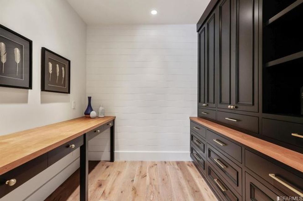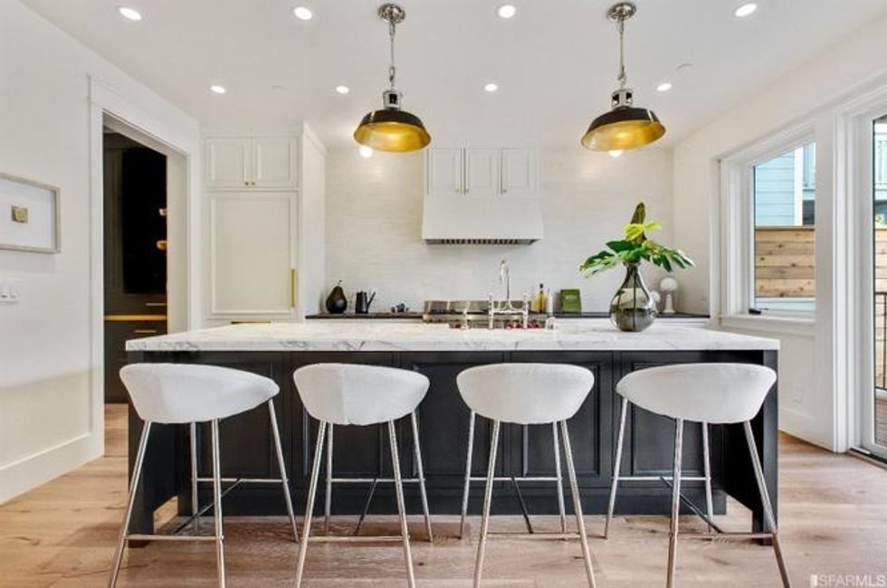 Past the front entry you'll be met with a cute sitting area, flooded in natural light from bay windows and kept comfy by a fireplace. In the back of the house, entertainers will be thrilled to find a chef's kitchen with a Calacatta marble-topped island, two dishwashers, soapstone countertops, and a walk-in pantry with two work stations—heaven for dinner party prep. Brass pulls and pendant lamps bring in a bit of glamour. When weather permits, you can take your meal out onto the ipe wood deck or beyond to the backyard for a picnic.
