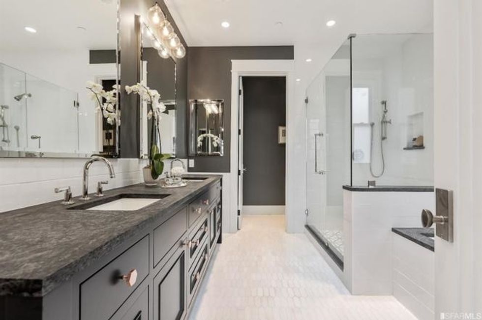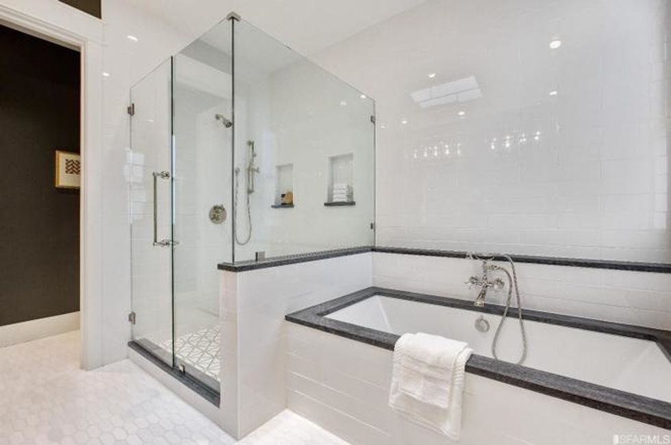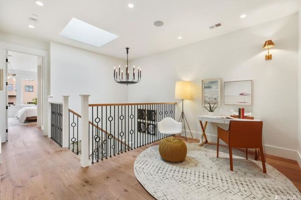 Upstairs, the master suite has a wall of windows, a sprawling walk-in closet, soaking tub, separate shower, and dual sinks, all dressed in marble and geometric tiles. Two additional bedrooms here have street-facing windows, and a loft space is perfect for a home office or sitting area. Three remote-controlled skylights top off the upper level.