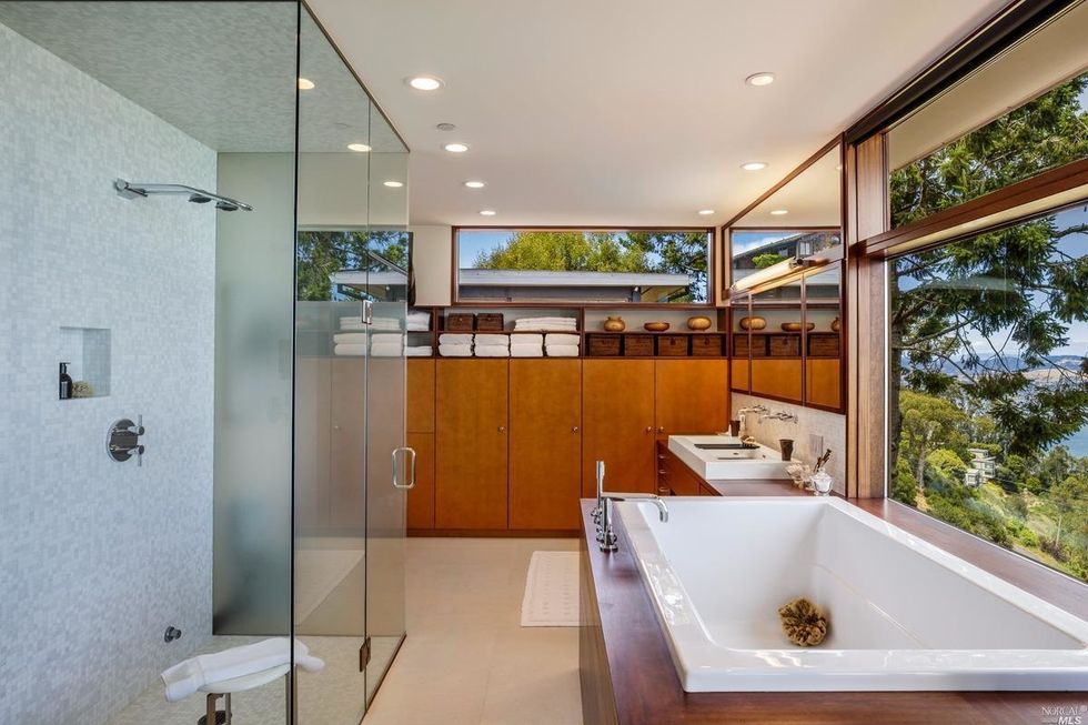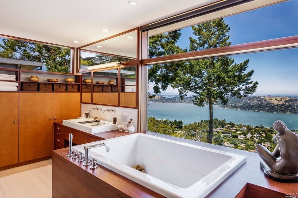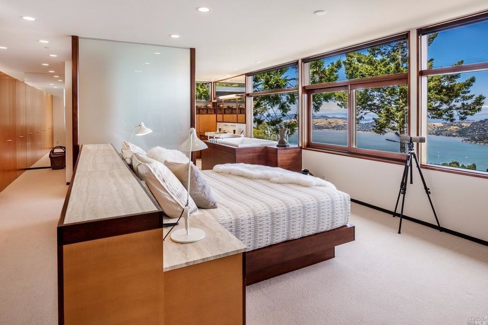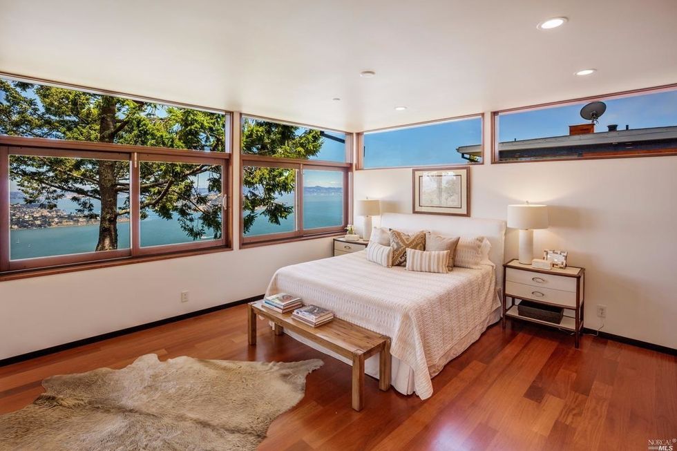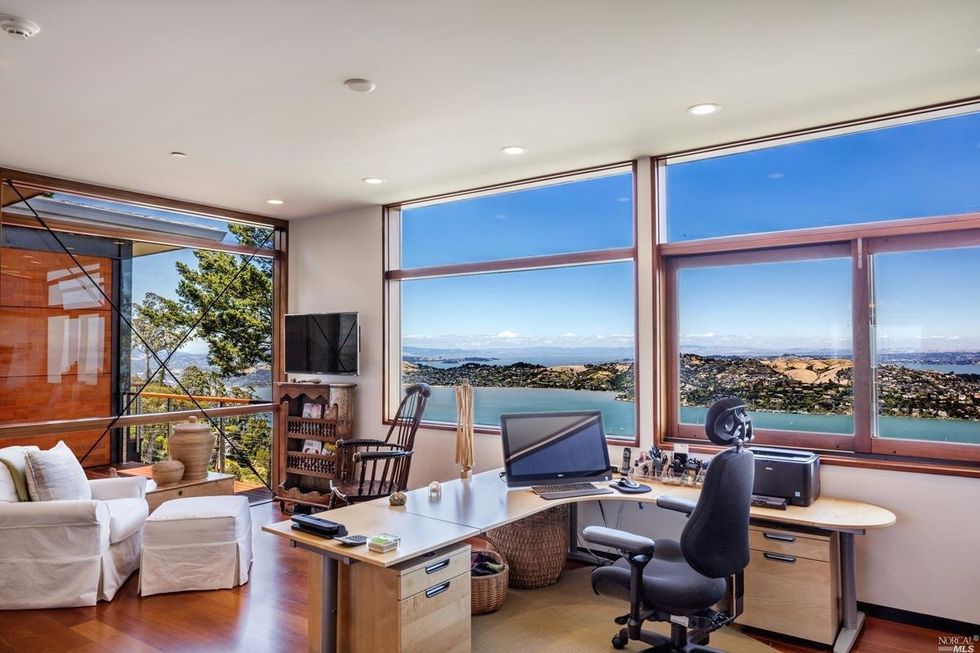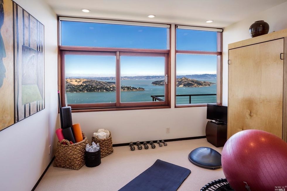 Wall-to-wall glass windows open up to expansive vistas that span eight counties, three glistening bays, and both Angel and Alcatraz islands—you can literally take in a different, unique view from each room of the house. You can even watch the Bay Bridge light show from your large soaking tub. Gorgeous wood accents run throughout the abode, offering a sense of modern warmth to the airy, neutral palette. The entire home recently underwent a full update, and has pretty much everything you'd need in a sanctuary, including a workout room, multiple bathtubs, closet and shelf space galore, endless outdoor lounge space, and office space should you ever get motivated to work.