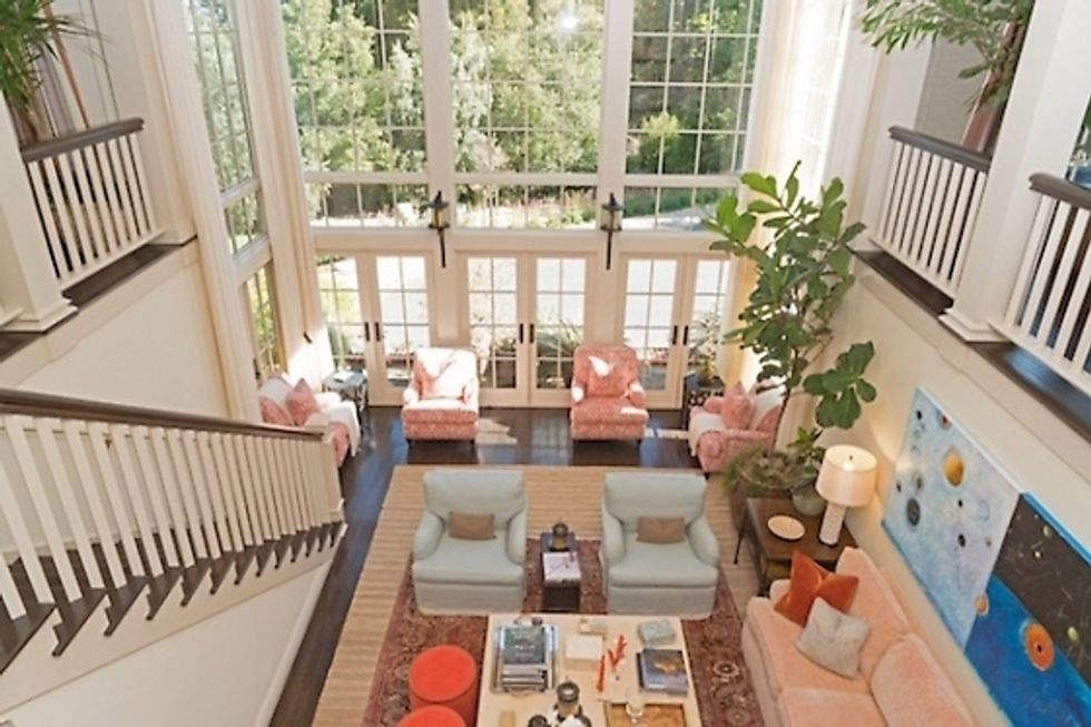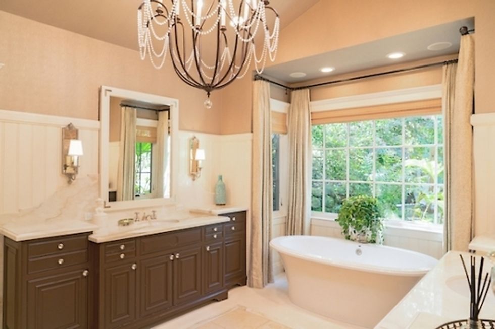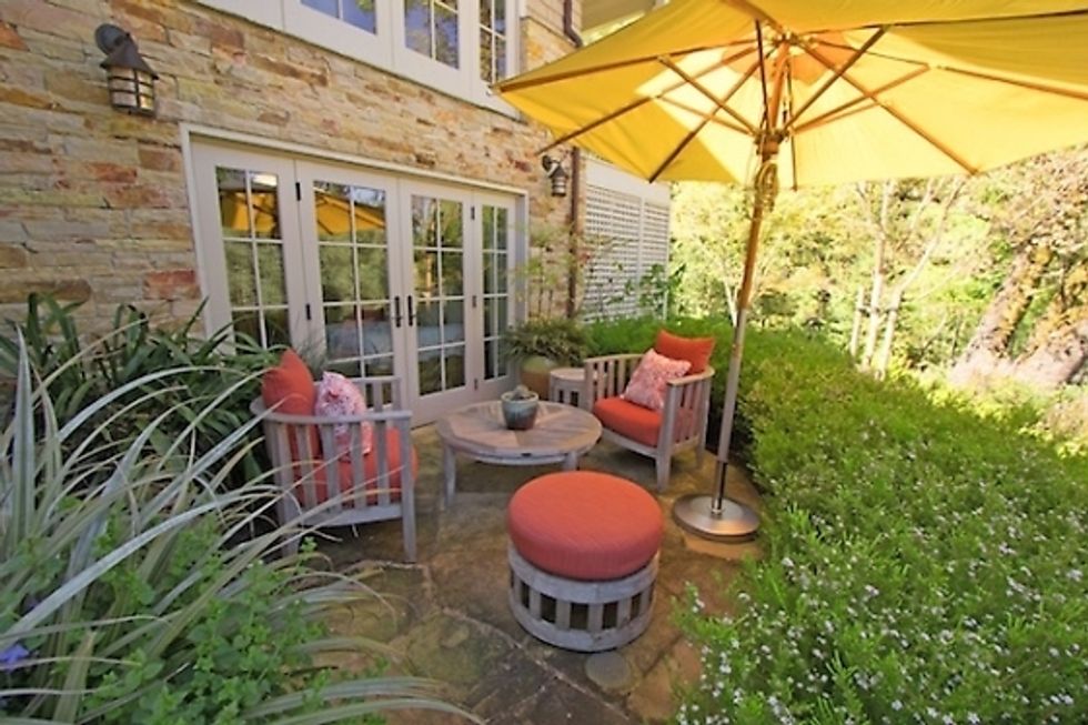 Upstairs, two sets of french doors lead out from the master suite to a private fern-laden master patio. Adjacent from the bedroom, the master bathroom doesn't disappoint: relax from a long day at the office in the jacuzzi soaking tub, while a jeweled Roman chandelier hangs from the vaulted ceiling. Oh, and did we mention the steam shower?
