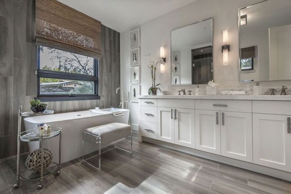 Inside, meanwhile, it's all R&R. In the master suite, vaulted ceilings lend the feeling of country charm; deep pile carpet feels plush between your toes; the bathroom has a luxurious freestanding tub, dual-sink vanity, and walk-in shower; and French doors open onto the pool.