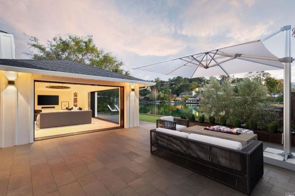 The single-level open floor plan has farmhouse-style charm in an earthy palette, white-washed beams, and warm wood floors. The dining room can accommodate an extra long table for big parties and opens onto a spacious stone patio where you could finish your favorite bottle or enjoy dessert by the fire pit. Also connected to the patio via sliding walls is the living room, which practically perches on the waterside deck and has yet another fireplace to keep things cozy.